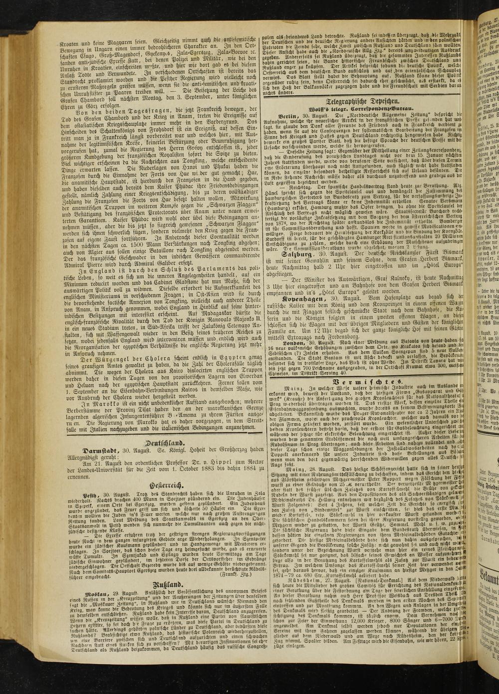 nShitoe Ircefie ftatt , bei denen Polizei und Militär, wie bei den fanben antt ju M Einschreiten m-fete, und hier wie dort gab es bei diesem Anlaß Todte und Verwundete. In oerschiedenen Ortschaften ist bereits das Standrecht proklamirt worden und die Pesther Reg.erung wird -lelletcht noch prnfti>rßn Maßregeln greisen müssen, wenn sie die anti-semttffchen und kroati- Len Ün uhstt ter zu Paaren treiben will. - Die Betsetzung er Leiche des Gmsen Chambord soll nächsten Montag, den 3. September, unter königlichen ^renSBUon@benerbSen Tagessragen, die jetzt Frankreich bewegen, der Dod des Grasen Chambord und der Krieg in Anam, treten bie Ereignisse aus