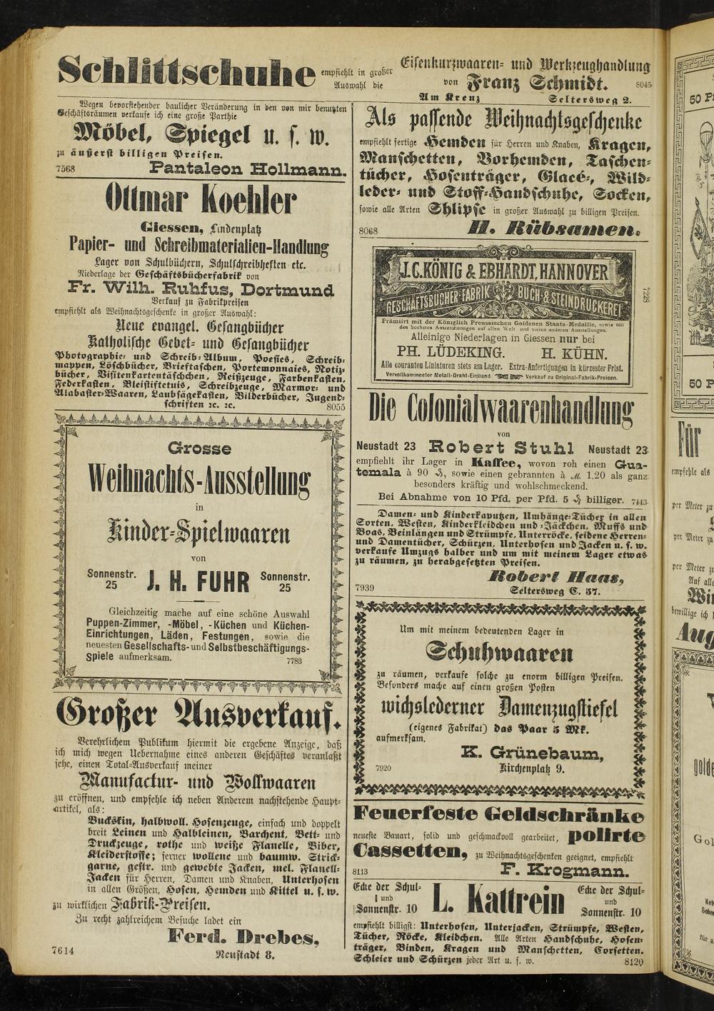 Als paffende Weihnachtsgeschenke empfiehlt fertige Hemden für Herren und Knaben, Kragen, Manschetten, Vorhemden, Taschentücher, Hosenträger, Maco-, Wildleder- und Stoff-Hanöschnhe, Socken, sowie alle Arten Shlipse i. großer Auswahl zu billigen Preisen.
