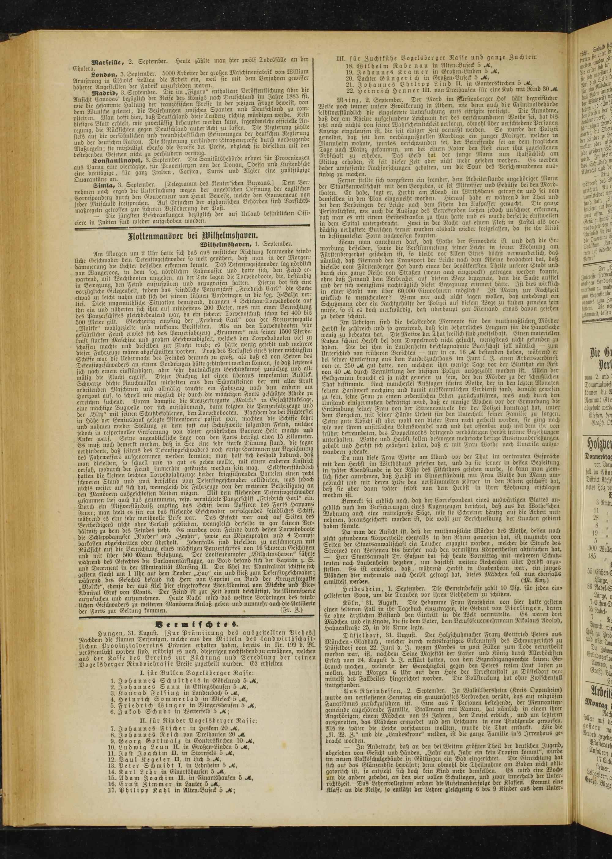 Marseille, 2. September. Heute zählte man hier zwölf Todesfälle an der ( London, 3. September. 5000 Arbeiter der großen Maschinenfabrik von William Arnlslroug in Elswick stellten die Arbeit ein, weil sic mit dem Verfahren gewliser höherer Angestellten der Fabrik unzufrieden waren. m „„ . .