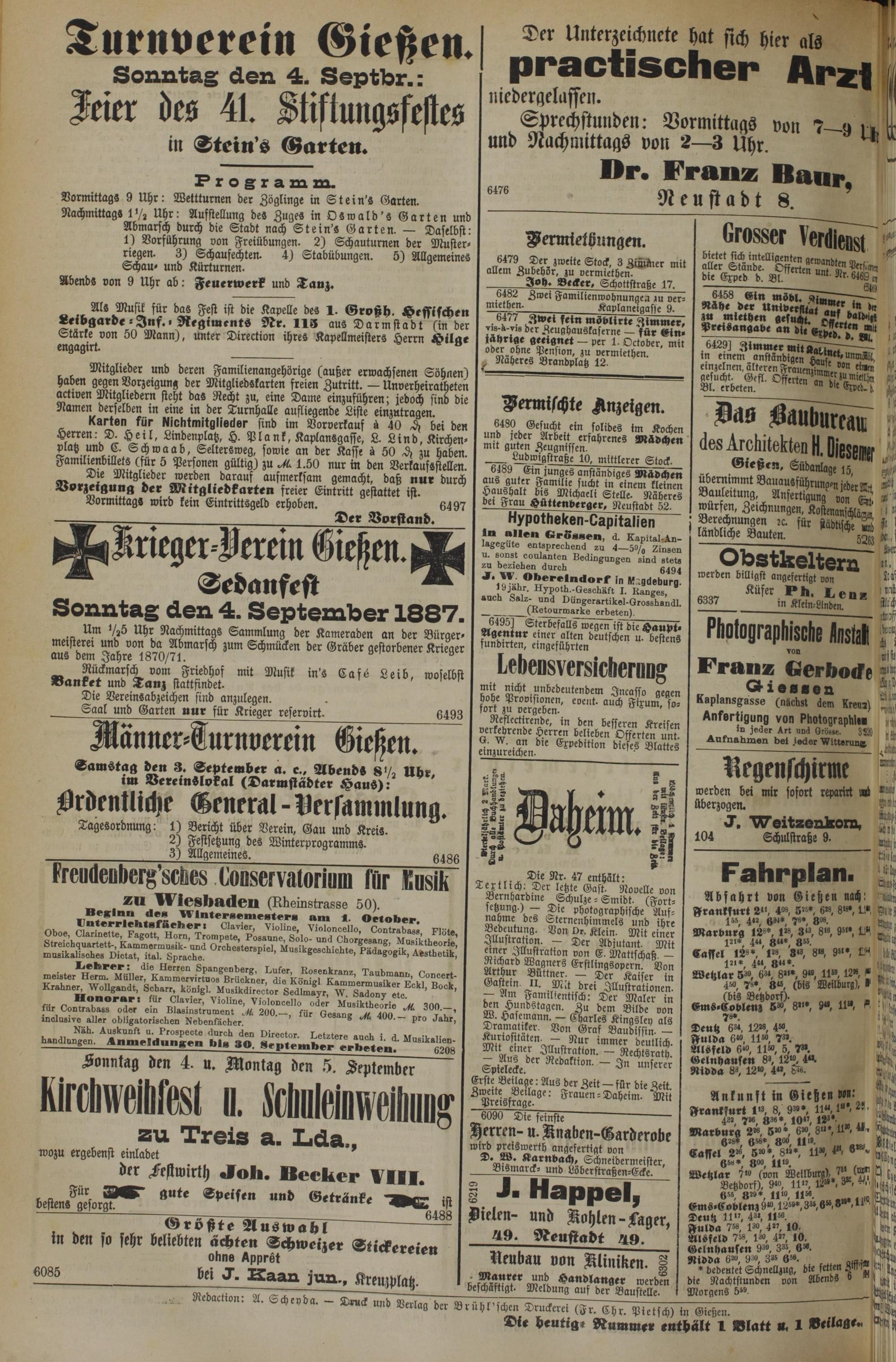 Als Musik für das Fest ist die Kapelle des 1. Großh. Hessischen Leibgarde - Inf., Regiments Nr. LIS aus Darmstadt (in der Stärke von 50 Mann), unter Direction ihres Kapellmeisters Herrn Hilae engagirt.
