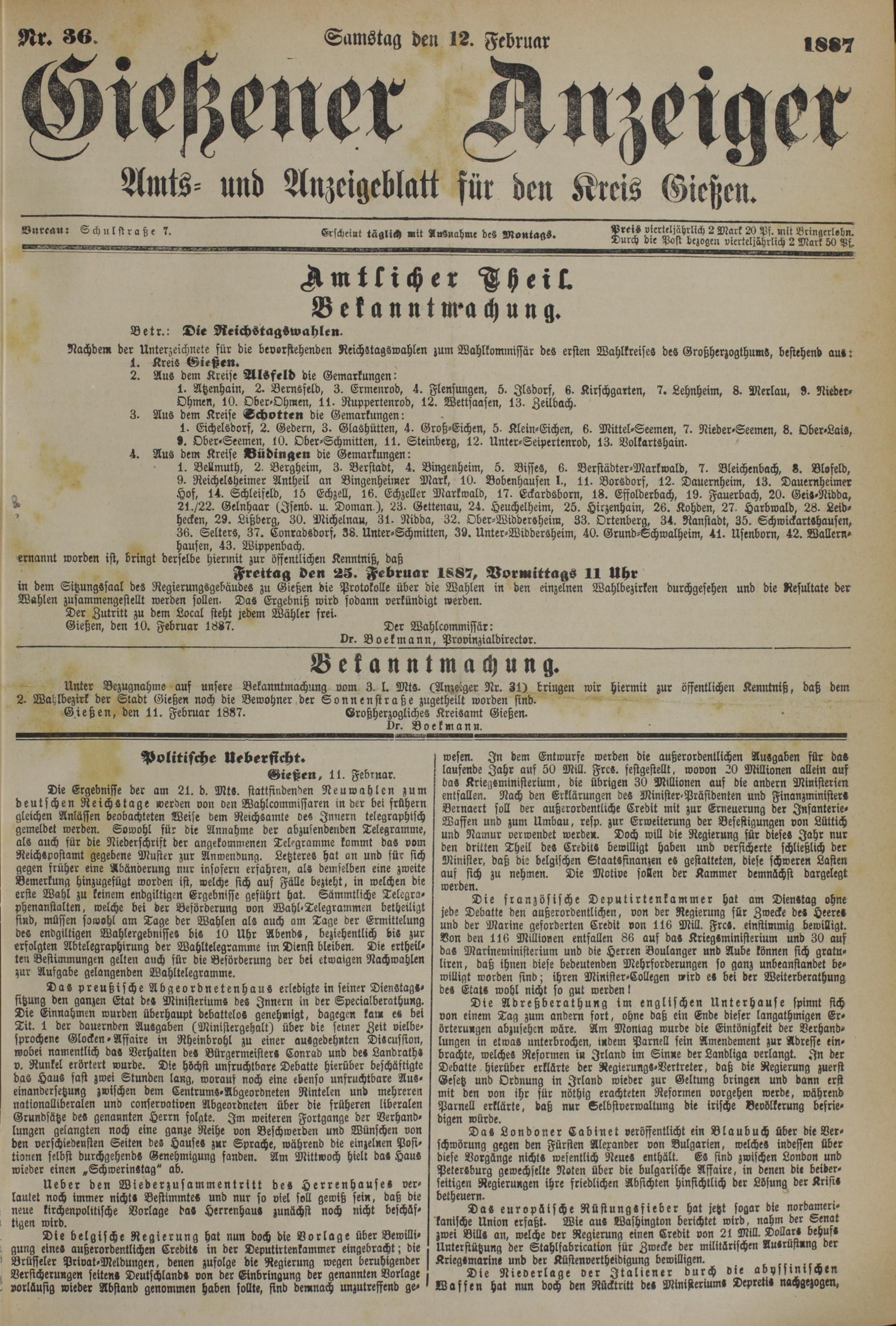 Gießen, den 10. Februar 1887. Der Wahlcommissär: