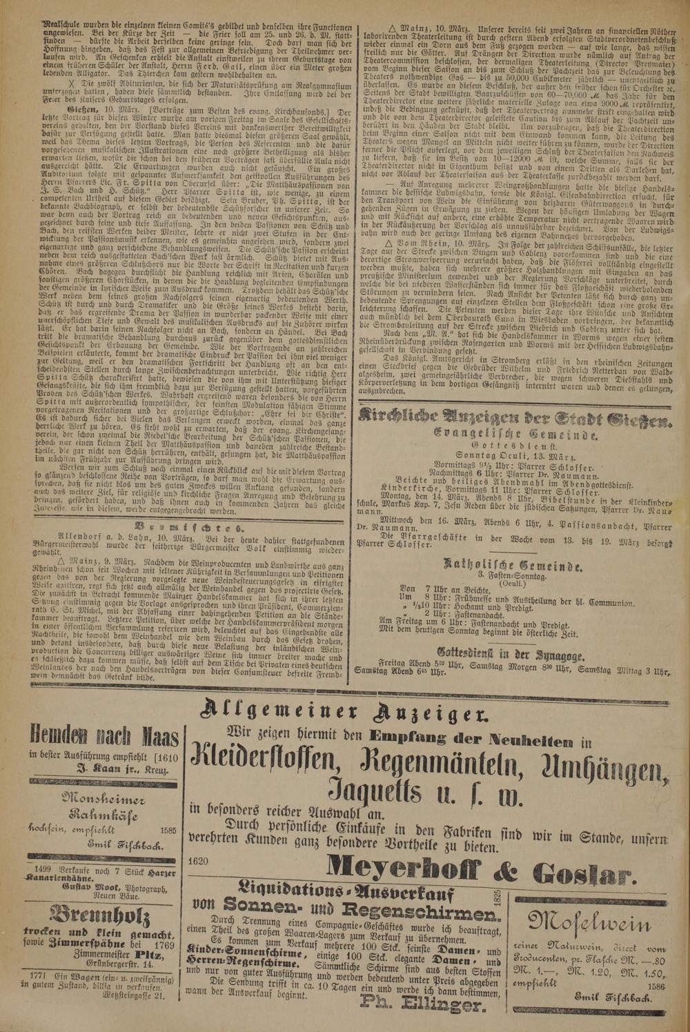 Gießen, 10. März. sVorträge zum Besten des evang. Kirchbaufonds.1 Der letzte Vortrag sur diesen Winter wurde am vorigen Freitag im Saale des Gescllschasts- vererns gehalten, den der Vorstand dieses Vereins mit dankenswerther Bereitwilligkeit Lasur zur Verfügung gestellt hatte. Man hatte diesmal diesen größeren Saal gewählt weil das Thema dieses letzten Vortrags, die Person des Referenten und die dafür vorgesehenen musikalischen Illustrationen eine noch größere Bethetligung als bisher erwarten liegen, wofür die schon bei den früheren Vorträgen säst überfüllte Aula nicht ausgercicht hatte. Die Erwartungen wurden auch nicht getäuscht. Ein großes Auditorium folgte mit gespannter Aufmerksamkeit den geistvollen Ausführungen des