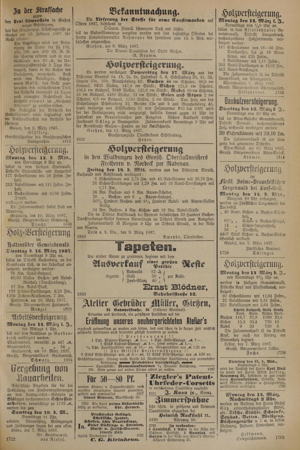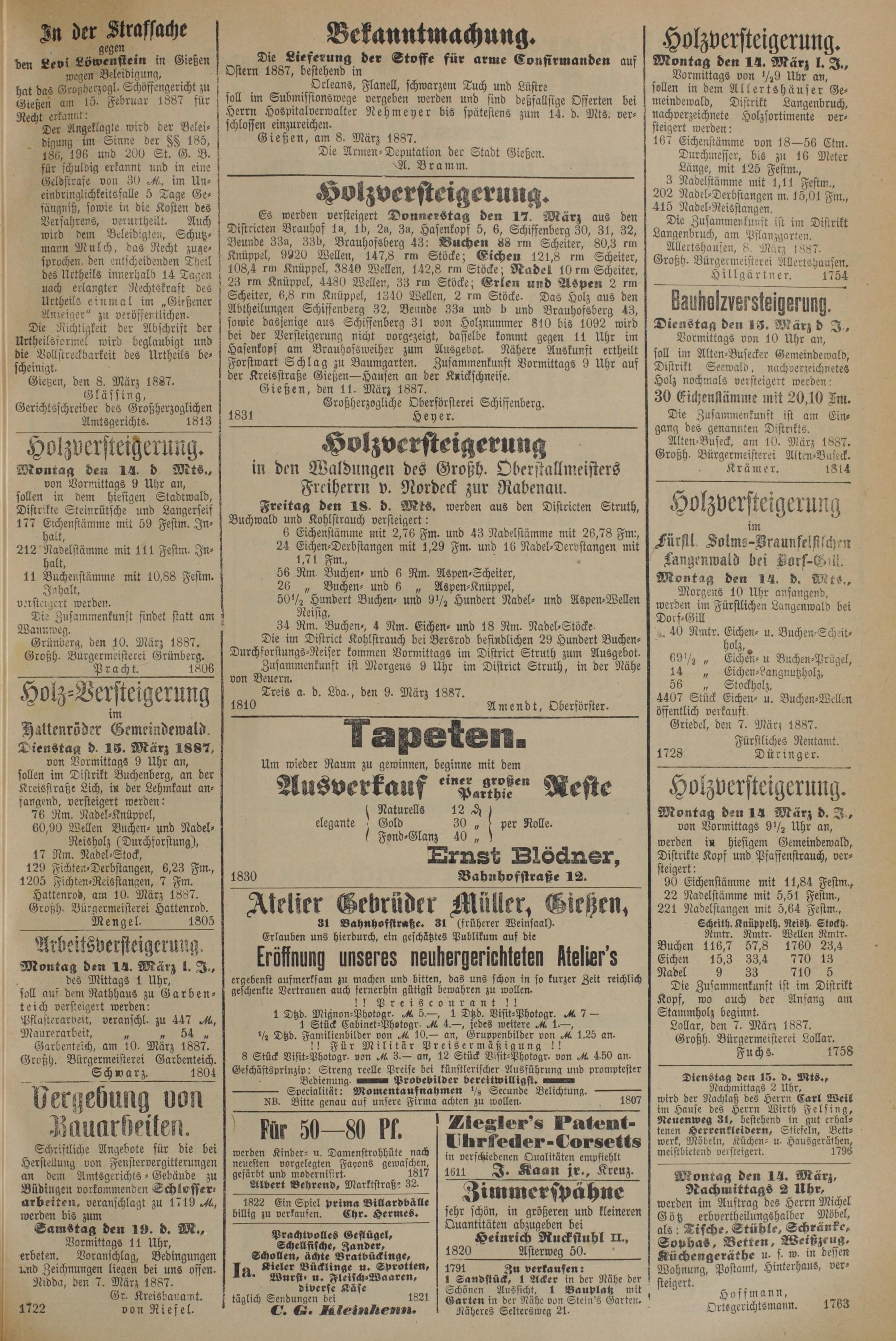 Hättenrödn Gcmrindewald. Dienstag b. 15. März 1887, von Vormittags 9 Uhr an, sollen im Distrikt Buchenberg, an der Kreisstraße Lich, in der Lehmkaut an- fangend, versteigert werden: