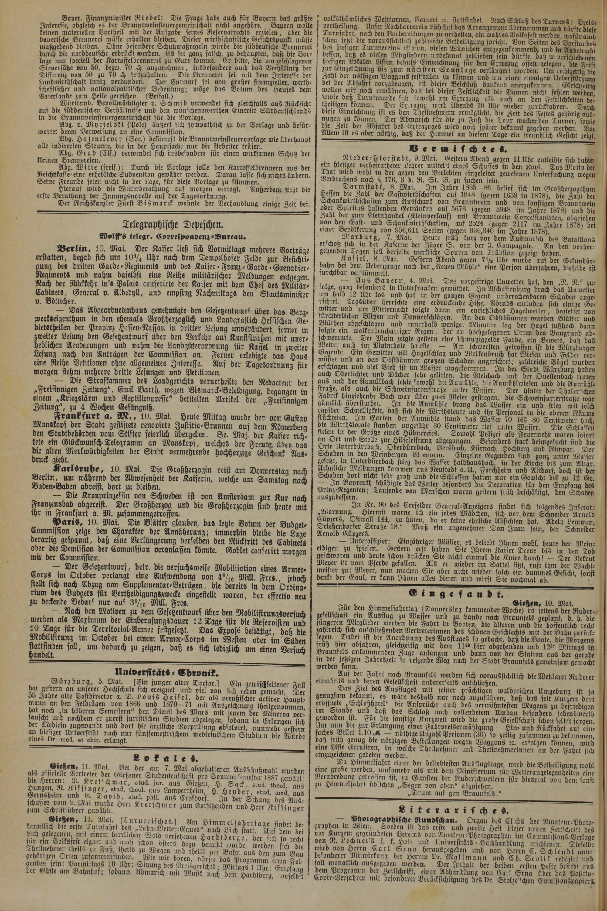 , , Kassel, 8. Mai. Gestern Abend gegen 71/2 Uhr wurde auf der Sekundär- bahn bei dem Uebergauge nach der „Neuen Mühle" eine Person überfahren, dieselbe ist furchtbar verstümmelt. 1