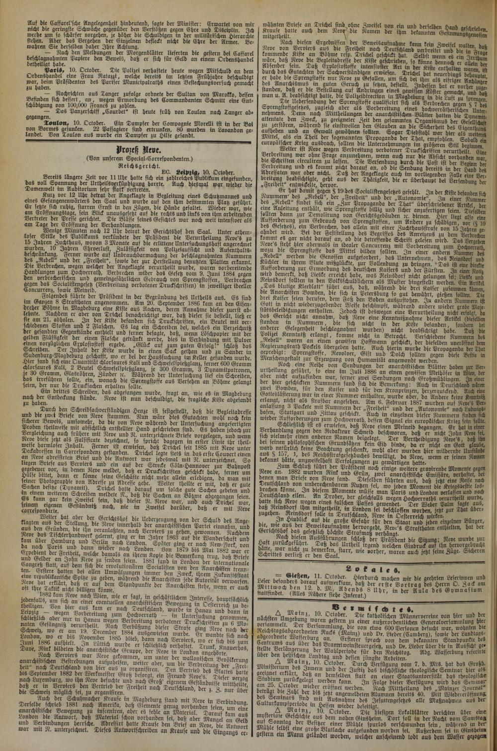 ShVjfTn n W ferner ist erwiesen, daß Drichel seit 1885 mit Neve unter %eJta?rbCxn- Drichel legte stets in das erste Couvert einen an Neve adressirten Brief unb bie Antwort war jedesmal mit N. unterzeichnet. So ^bn Briefe aus Vcrviers unb ein auf ber Strecke Cöln-Hannooer zur Bahnpoft f?ülfbe bmet henn ^Enen Neve mdbet, daß er Druckschriften geschickt habe, ferner um q!!!6?' ^bnn er könne seine Geschäfte Nicht mehr allein erledigen, ba man mit e .Adresse zu Adresse gehe. Weiter thetlte er mit, daß er gute ©adjen besitze (Dynamit). Drichel hatte darauf um solche gute Sachen gebeten und (53C S» teren Schreiben meldete N., daß die Sachen an Bödme abgegangen seien. Es kann gar kein Zweifel fein, daß dieser N. Neve war, und auch Drichel war ("rrespondirte^ ®cftanbnt6 "ach, nie in Zweifel darüber, daß er mit Neve frnntp« nitaCx ^*arrCr bc?. Gcrichtshof die Ueberzcugung von der Schuld des Anae- nuFh™ ex blc Neve innerhalb der anarchistischen Partei einnabm' urib veranlaßten, nach Verviers zu gehen, gewonnen Nachdem iÄl! Tischlerhandwerk gelernt, ging er im Jahre 1863 auf die Wanderschaft unb fam über Hamburg unb Berlin nach Lonbon. Später ging er nach New-Bork nnn t banJk nach Lonbon. Von 18?9 bis Mai 1882 war er welche bamals an ihrem Kopfe bie Bemerkung trug, daß Briefe ^oe iu senden seien. 1881 fand in London der internatwna e Eongreß statt, auf dem sich ote revolutionären Socialisten von den Anarchisten trpnn dm rÄ bei allen Umwälzungen immei den Zweck th«m Zu un! sst a eine republikanische Spitze zu geben, wahrend die Anarchisten jede Autorität n<>rn nr£n