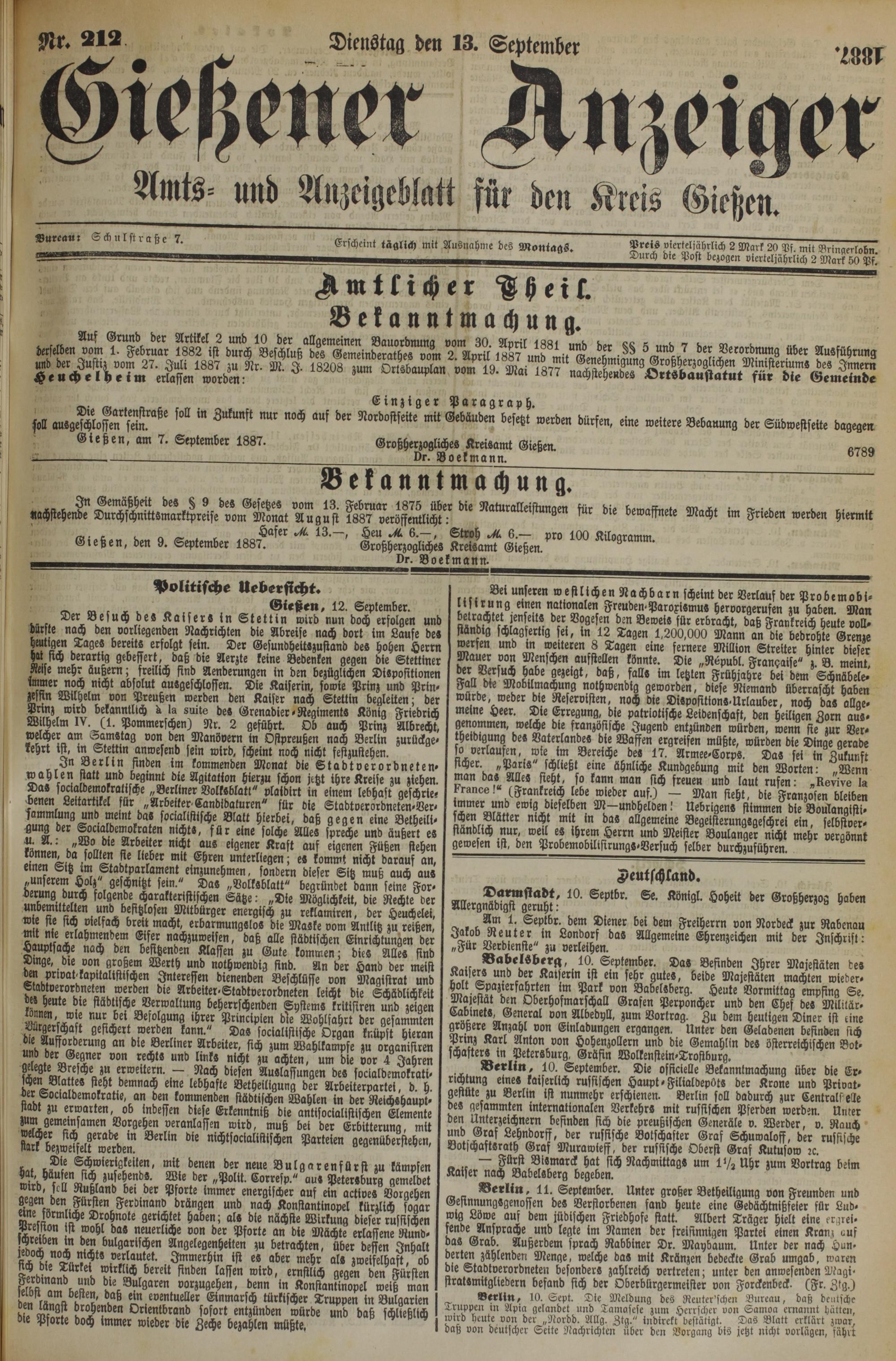 @ieBen, am 7. September 1887. Großherzogliches Kreisamt Gießen. ß7QQ