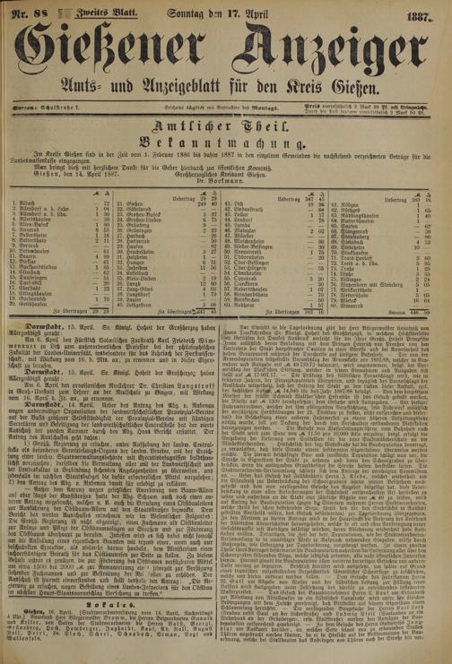Gießen, den 14. April 1887. Großherzogliches Kreisamt Gießen.