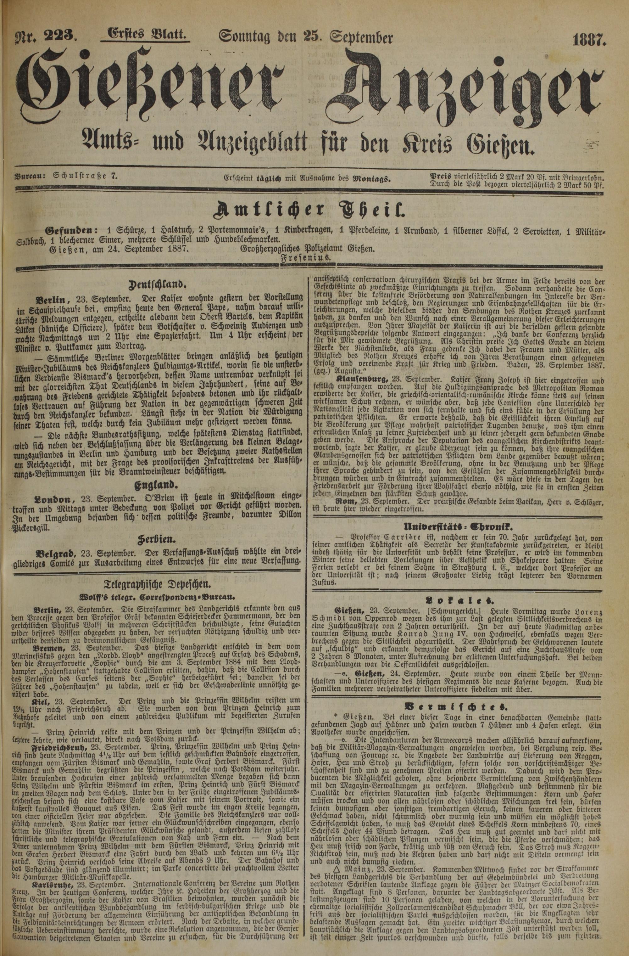 Gießen, am 24. September 1887. Großherzoglicher Polizeiamt Gießen.