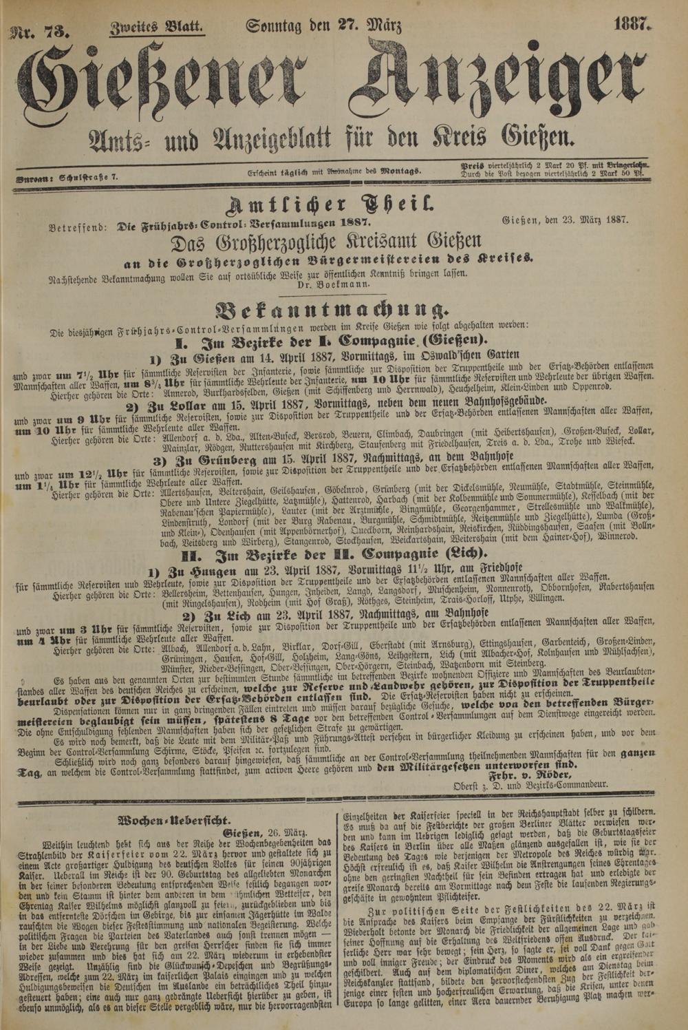 Betreffend: Die Frühjahrs- Control - Versammlungen 188?. Großen, den 23. Marz 1887.