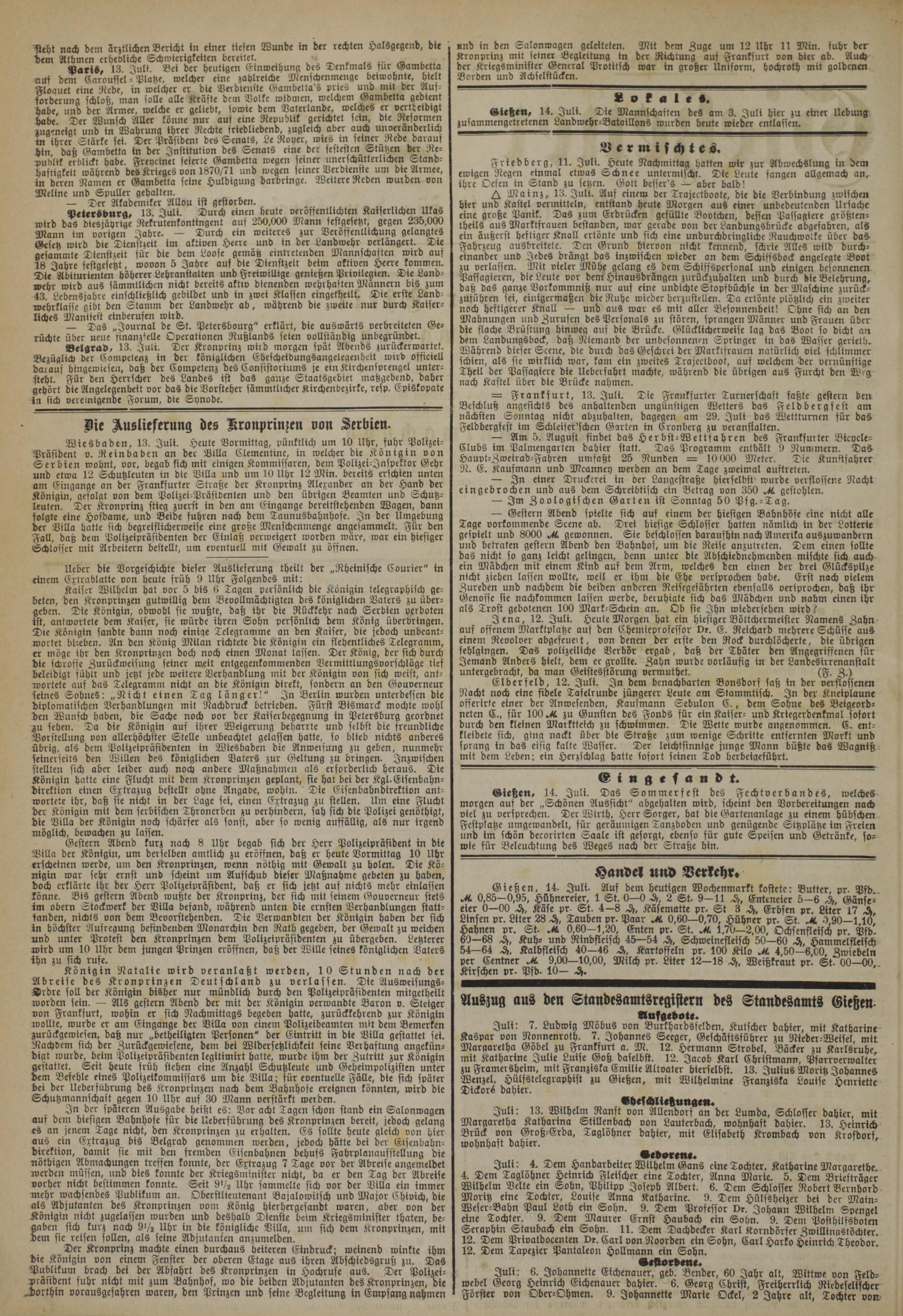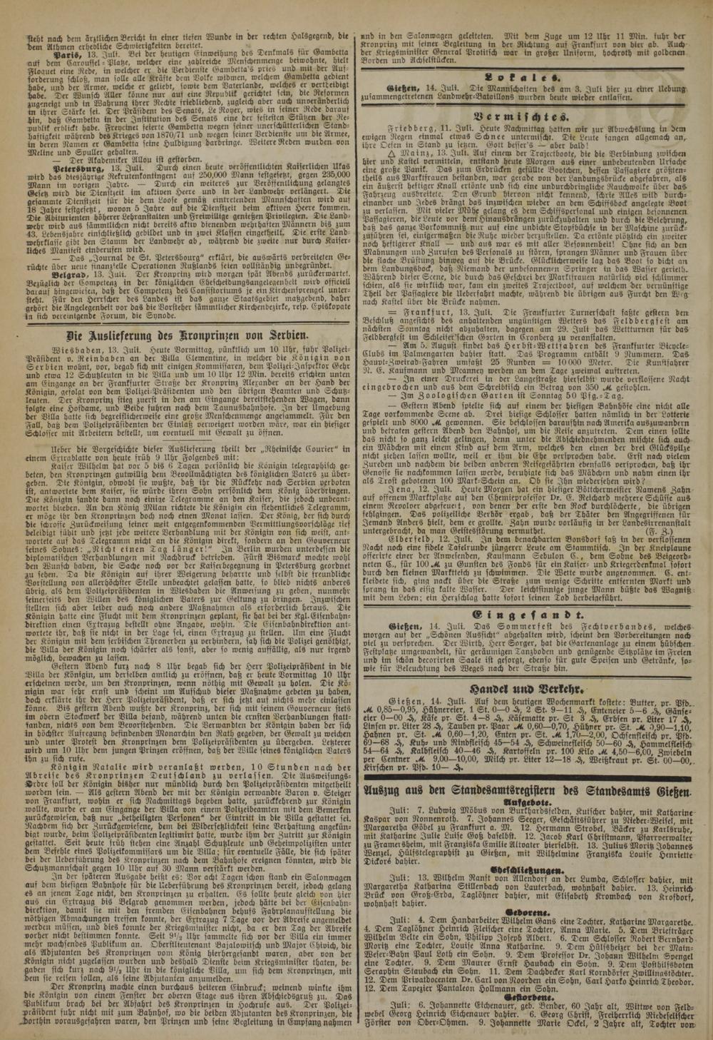 Juli: 4. Dem Handarbeiter Wilhelm Gans eine Tochter, Katharine Margarethe. 4. Dem Taglöhner Heinrich Fleischer eine Tochter, Anna Marie. 5. Dem Briefträger Wilhelm Veite ein Sohn, Philipp Joseph Albert. 6. Dem Schlosser Robert Bernhard Moritz eine Tochter, Louise Anna Katharine. 9. Dem Hülssheizer bei der Main- Weser-Bahn Paul Loth ein Sohn. 9. Dem Professor Dr. Johann Wilhelm Spenge! eine Tochter. 9. Dem Maurer Ernst Haubach ein Sohn. 9. Dem Post Hilfsboten Seraphin Staubach ein Sohn. 11. Dem Dachdecker Karl Korndörfer Zwillingstöchter. 12. Dem Privatdocenten Dr. Carl von Noorden ein Sohn, Carl Harko Heinrich Theodor. 12. Dem Tapezier Pantaleon Hollmann ein Sohn.