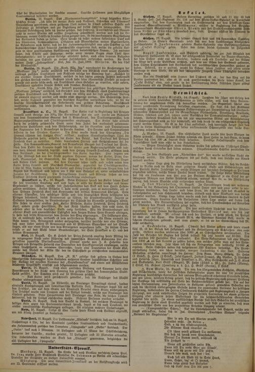 Gießen, 17. August. Gestern Vormittag zwischen 10 und 11 Uhr ist daS 2. Großh. Hess. Inf.-Regiment Nr. 116 auf dem Main-Neckar-Bahnhos in Darmstadt eingetroffen. Auf dem Exercierplatz fand ein Vorbeimarsch vor dem Divisions-Com- mandeur Generallteutenant v. Wissmann, welcher in Begleitung des Brigade- Commandeurs Generalmajor Edler v. Planitz und des Stadt-Commandanten Freiherrn Röder zu Diersburg anwesend war, statt. Hierauf rückten die Truppen in das Griesheimer Lager ab.
