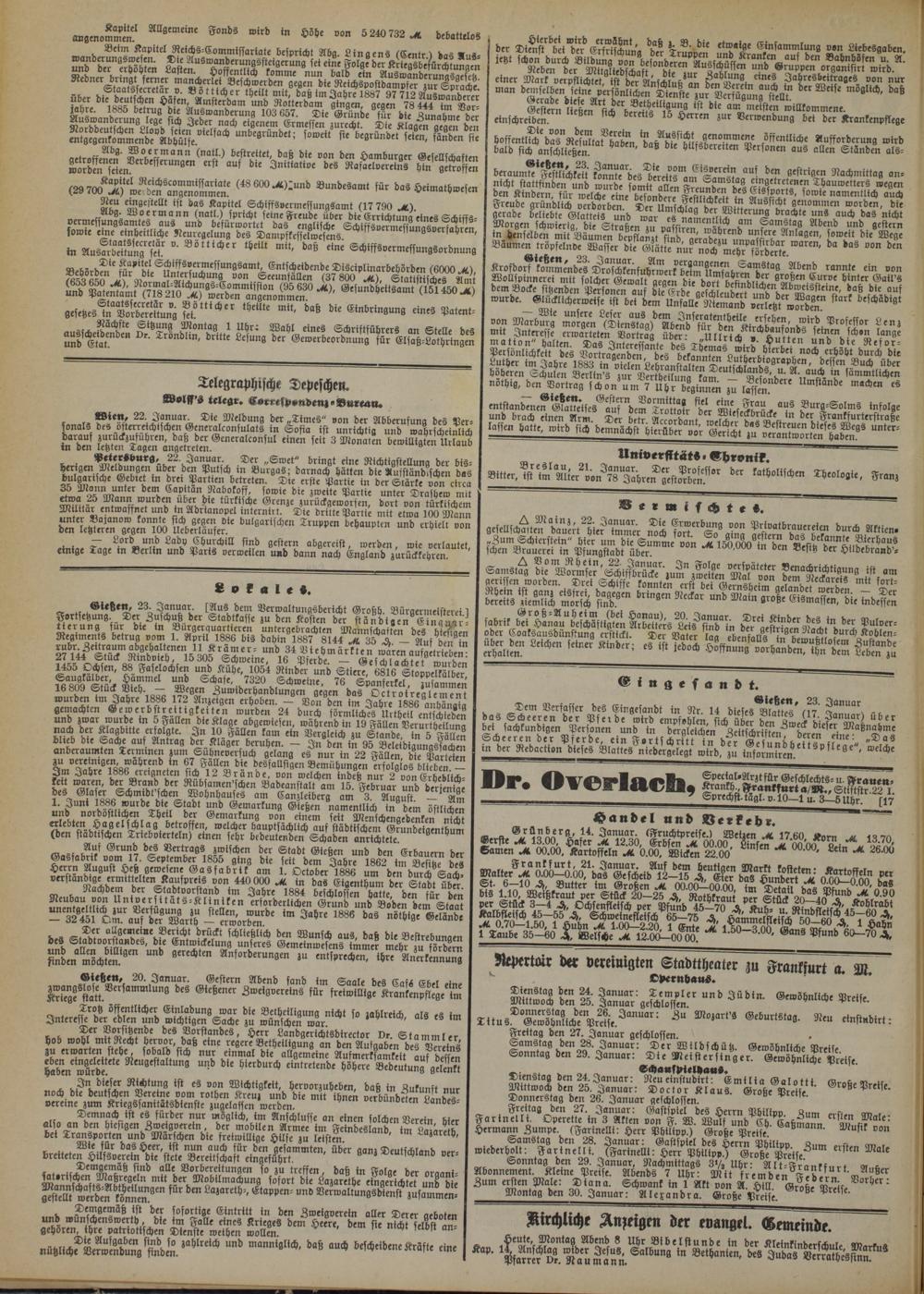 « .i ®te8e”' 23- Januar. (Aus dem Verwaltungsbericht Großh. Bürgermeisterei 1 Fortsetzung Der Zuschuß der Stadtkasse zu den Kosten der ständigen Eing^r- tierung für die in Bargerquartieren untergebrachten Mannschaften des hiesiaen Regimen s betrug vom 1. April 1886 bis dahin 1887 8144 35 - Auf d u n