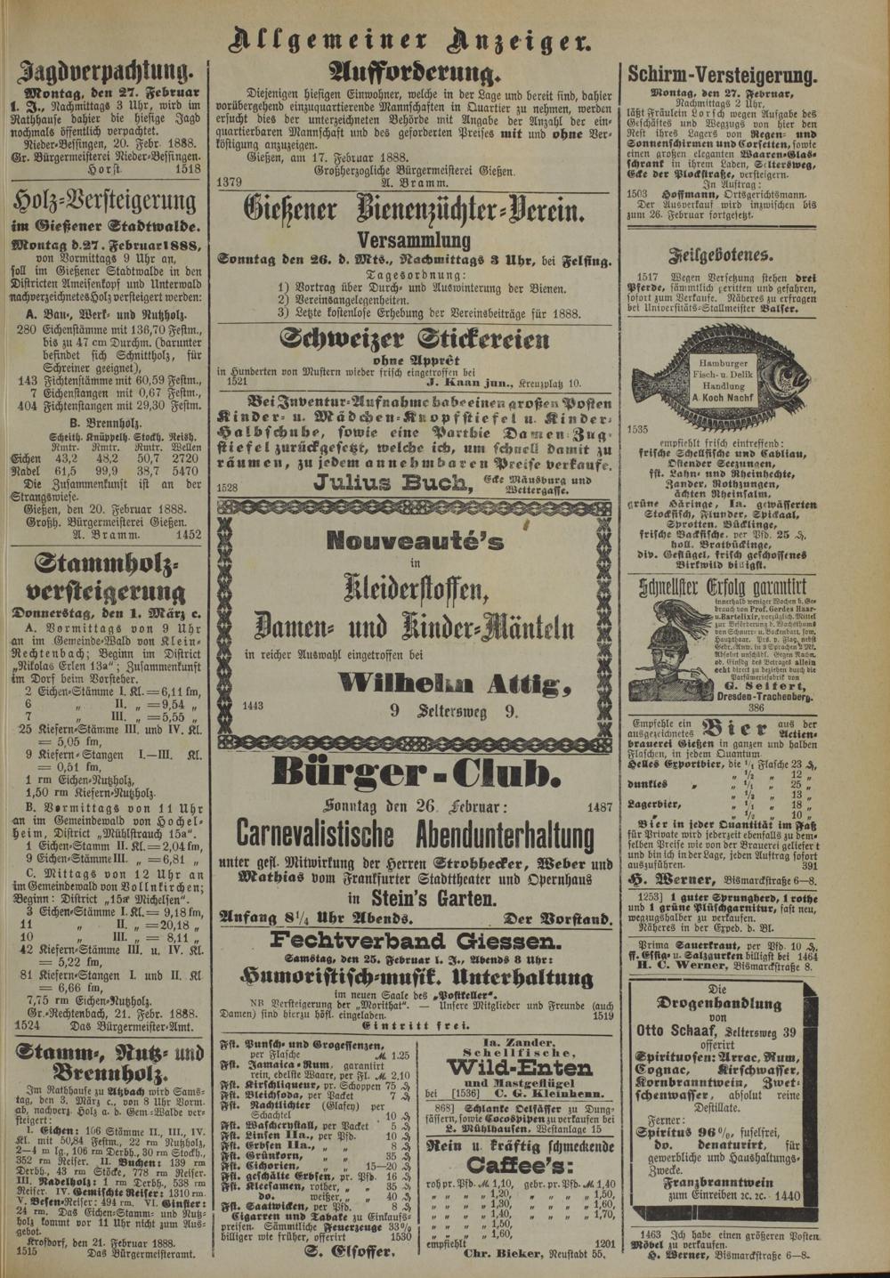 Gießen, den 20. Februar 1888. Großh. Bürgermeisterei Gießen.