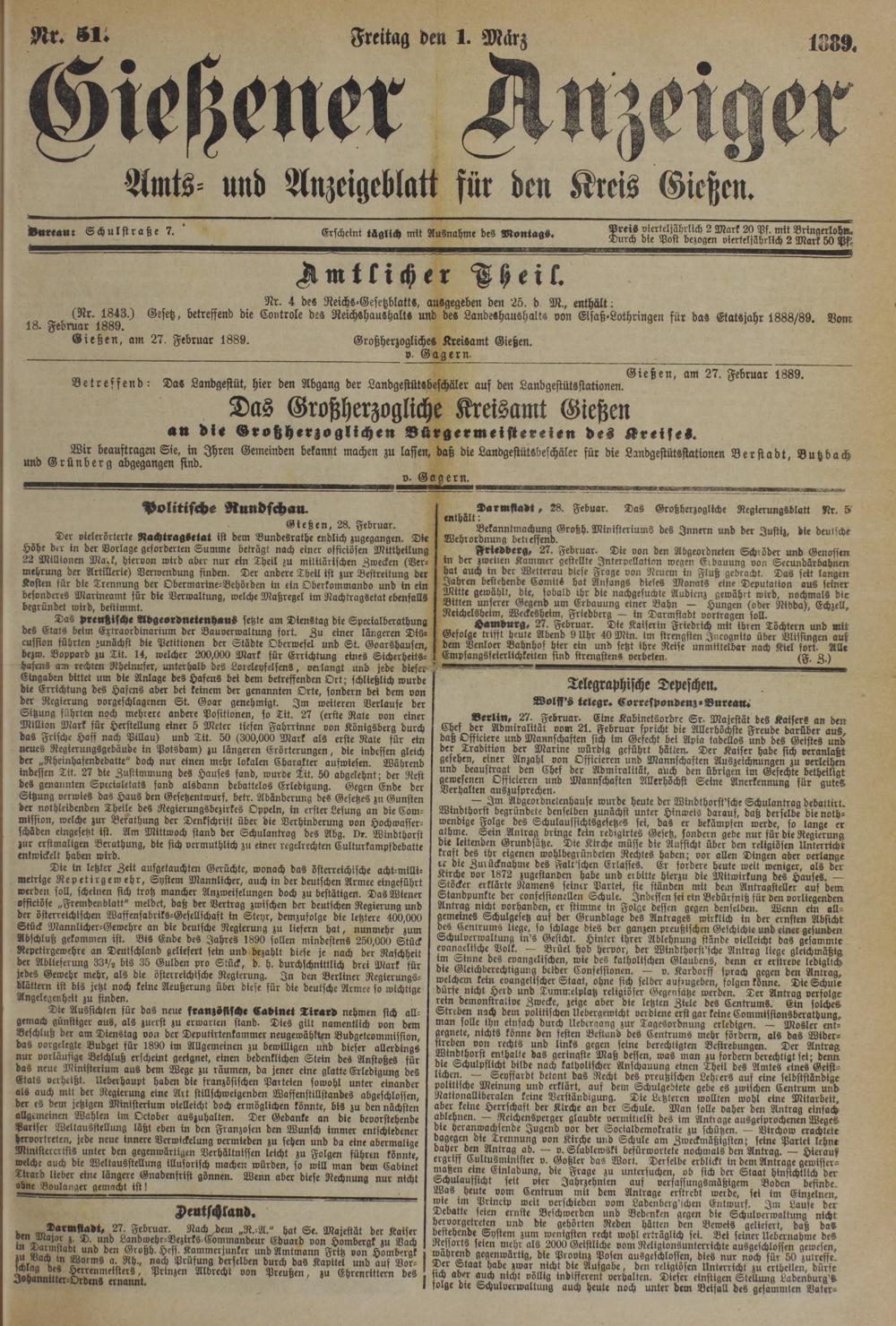 Gießen, am 27. Februar 1889. Großherzogliche- Kreisamt Gießen.