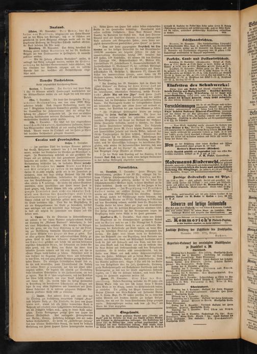 Frankfurt a. M., 1. December. Nach einem von Seiten des Magistrats an die Einwohnerschaft gerichteten Aufruf wird der Kaiser nach der um 1 Uhr Mittags des 9. December stattfindenden Ankunft durch die neu zu eröffnende Verlängerung der Kaiserstraße zur Stadt fahren, an deren Eingang die städtischen Behörden zum Empfang versammelt sein werden. Die Fahrt wird sodann durch die Kaiserstraße, über den Roßmarkt (wo eine Begrüßung durch Vertreter von Handel und Gewerbe, Kunst und Wissenschaft stattfinden wird) durch die Zeil und Fahrgafse nach dem Dom, von hier über den alten Markt nach dem Römer und von da vielleicht über die Neue Kräme und Liebfrauenstraße nach dem Postgebäude stattfinden. Es ist indessen nicht unwahrscheinlich, daß der Kaiser vom Römer aus noch andere Sehenswürdigkeiten, etwa den Hafen, besichtigen und zu diesem Behuf die Neue Kräme, Liebfrauenstraße, Kaiser- und Friedensstraße, sowie den Mainkai passiren wird. Gegen 5 Uhr will sich der Kaiser von dem Postgebäude über die Zeil, Hauptwache, Steinweg, große Bockenheimergasse und Bockenheimer Landstraße nach dem Palmengarten zu dem von der Stadt angebotenen Festmah begeben, um 7 Uhr die Festoper besuchen, nach deren Beendigung die Heimreise angetreten werden soll.