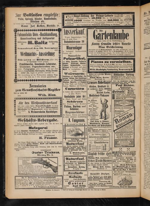 Classiker, Jugendschriften etc,, Z sowie Photographien jeder Grösse mit und ohne X Rahmen, Emaillebilder, Verrotypien, Stiche, Chromo- Z bilder etc. liegen in grösster Auswahl vor. X Die Ausstellung ist bis Weihnachten jeden Tag M von 8 Uhr früh bis 7 Uhr Abends geöffnet. M
