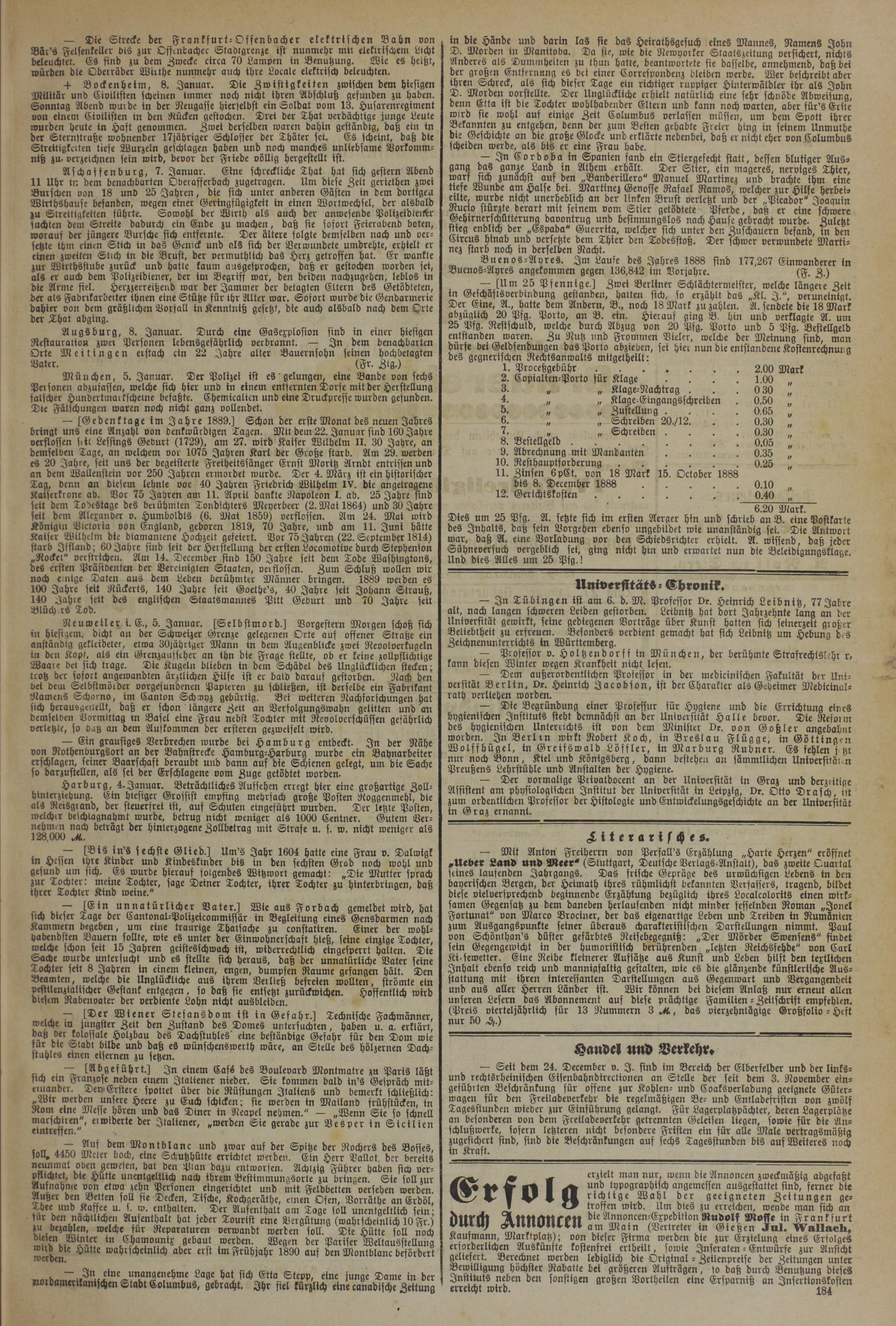 — [Ilm 25 Pfennige.] Zwei Berliner Schlächtermeister, welche längere Zeit in Geschäftsverbindung gestanden, halten sich, so erzählt das „Kl. I.", veruneinigt. Der Eine, A., hatte dem Andern, B., noch 18 Mark zu zahlen. A. sendete die 18 Mark abzüglich 20 Pfg. Porto, an B. ein. Hierauf ging B. hin und verklagte A. um 25 Pfg. Restschuld, welche durch Abzug von 20 Pfg. Porto und 5 Pfg. Bestellgeld entstanden waren. Zu Nutz und Frommen Vieler, welche der Meinung sind, man dürfe bei Geldsendungen das Porto abzieben, sei hier nun die entstandene Kostenrechnur g des gegnerischen Rechtsanwalts mitgetheilt: