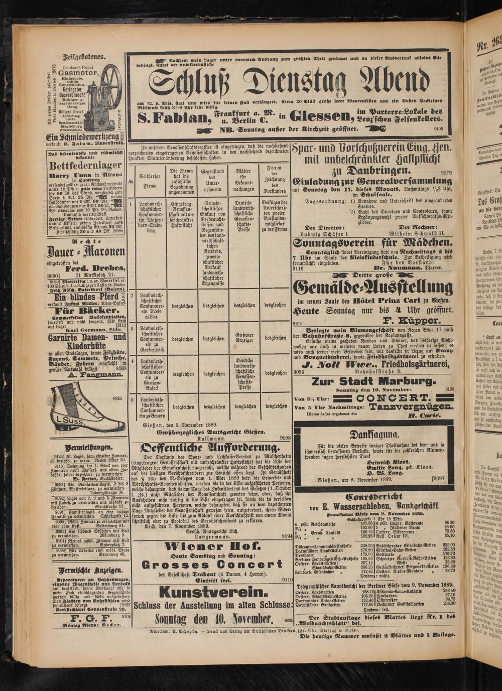 Telegraphischer Cvursdericht der Berliner Börse vom 9. November 1889.