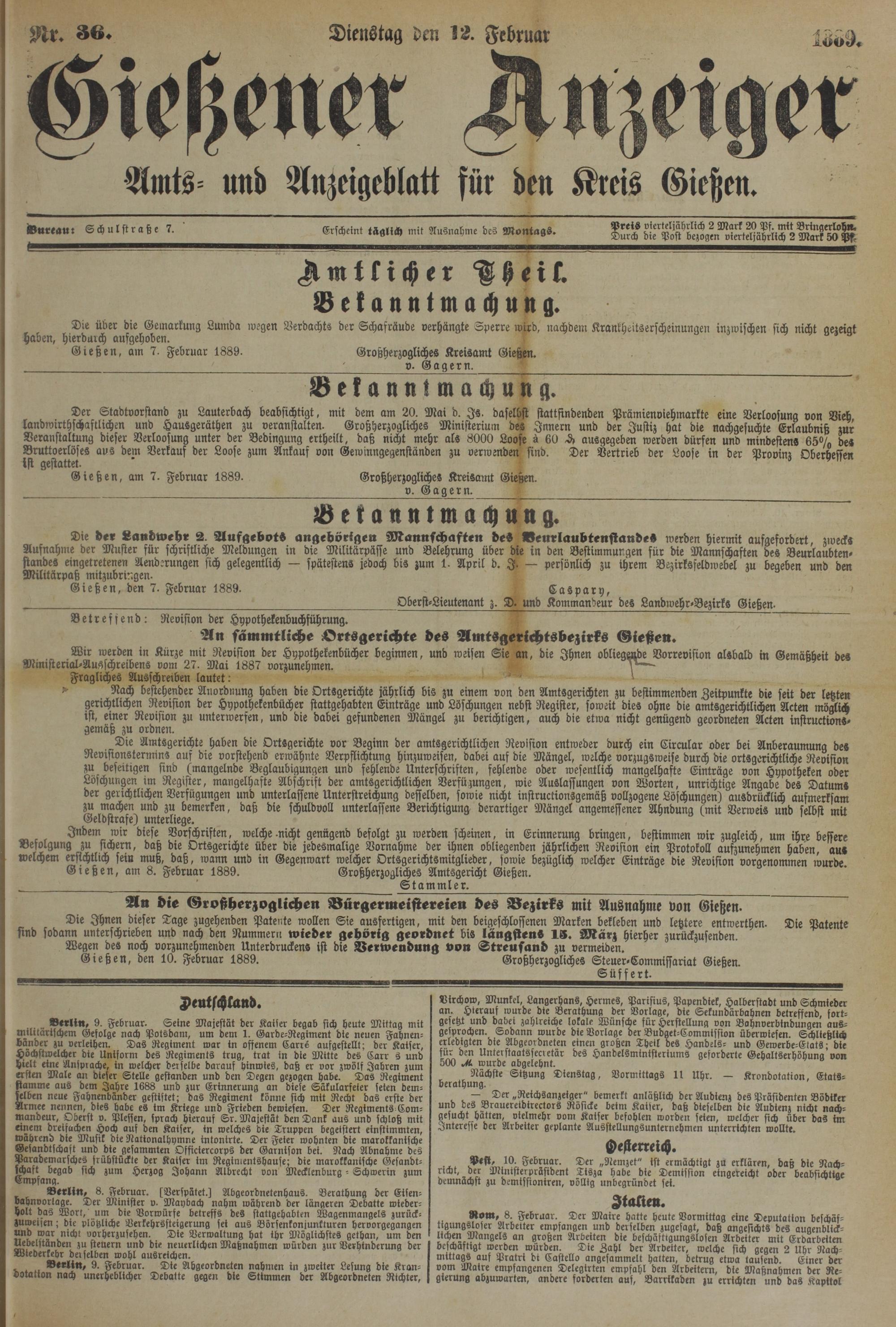Gießen, den 10. Februar 1889. Großherzogliches Steuer-Commissariat Gießen.
