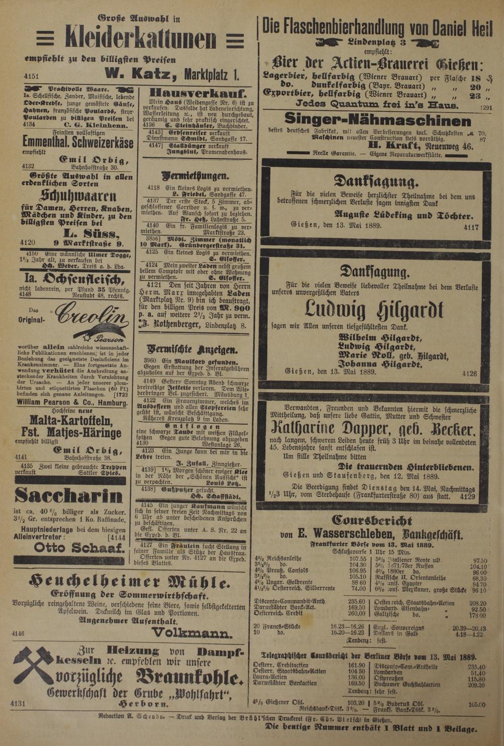 ,, „ „Die Beerdigung findet Dienstag den 14. Mai, Nachmittags V-3 Uhr, vom Sterbehause (Frankfurterstraße 80) aus statt. 4129