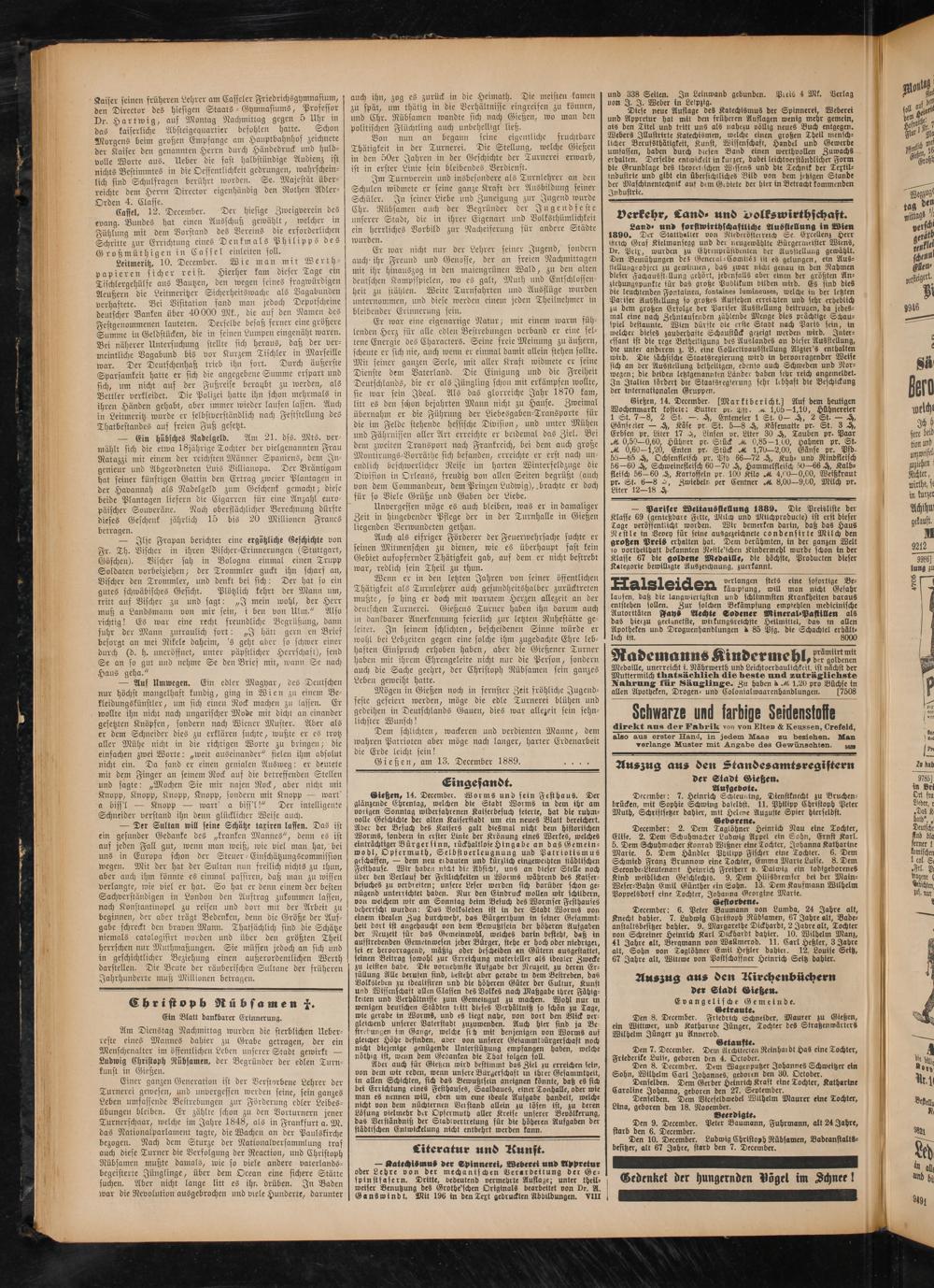 December: 2. Dem Taglöhner Heinrich Nau eine Tochter, Elise. 2. Dem Schuhmacker Ludwig Appel ein Sohn, Ernst Karl. 5. Dem Schuhmacher Konrad Wißner eine Tochter, Johanna Katharine Marie. 5. Dem Händler Philipp Fischer eine Tochter. 6. Dem Schmied Franz Brunnow eine Tochter, Emma Marie Luise. 8. Dem Seconde-Lieutenant Heinrich Freiherr v. Datwig ein todtgeborenes Kind weiblichen Geschlechts. 9. Dem Hilssbremser bei der Main- Weser-Bahn Emil Günther ein Sohn. 13. Dem Kaufmann Wilhelm Poppelsdorf eine Tochter, Johanna Georgine Marie.