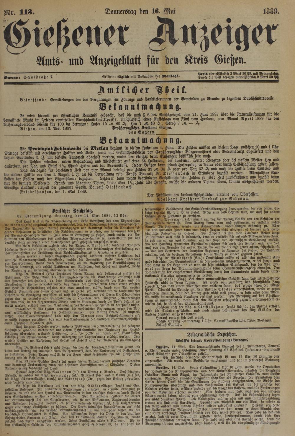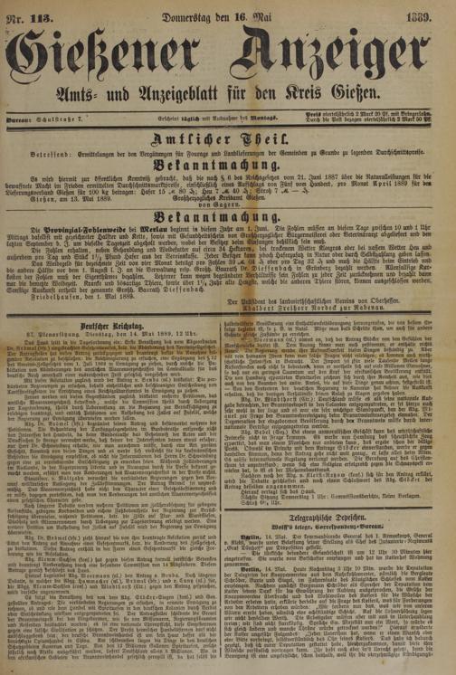 Gießen, am 13. Mai 1889. Großherzogliches Kreisamt Gießen.