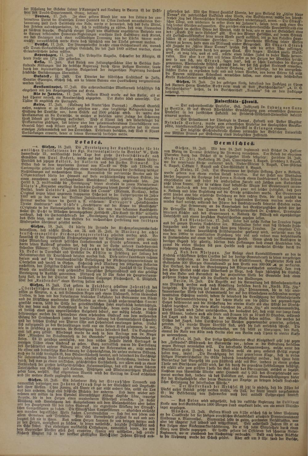 London, 17. Juli. In einer gestern Abend hier von den Leitern der con- seroattoen Partei im Stadtthett Tower Humlets im Osten Londons veranstalteten Ver- sammlung hielt Lord Salisbury eine Rede, worin er heroorhob, daß das beste Mittel den Freden aufrechtzuerhalten, sei, sich so vollständig zu rüsten, daß man Wtemanöen 3ix furchten brauche. Bezüglich einiger jüngst von Gladstone angeführten Beispiele von tn Europa bestehenden Homerule-Regierungen erwähnte Lord Salisbury auch Kretas wo das Verlangen nach einer vollständigen Trennung von der Türket immer mehr wachse; voraussichtlich werde Kreta doch schließlich von der Türkei getrennt werden „ "d-üffel, 17. Juli. Der Finanzmintster brachte einen Gesetzentwurf ein, wonach olle Detail-Verkaufsstellen geistiger Getränke, die seit Juli 1889 eröffnet wurden, einen Erlaubntßschetn haben müssen.