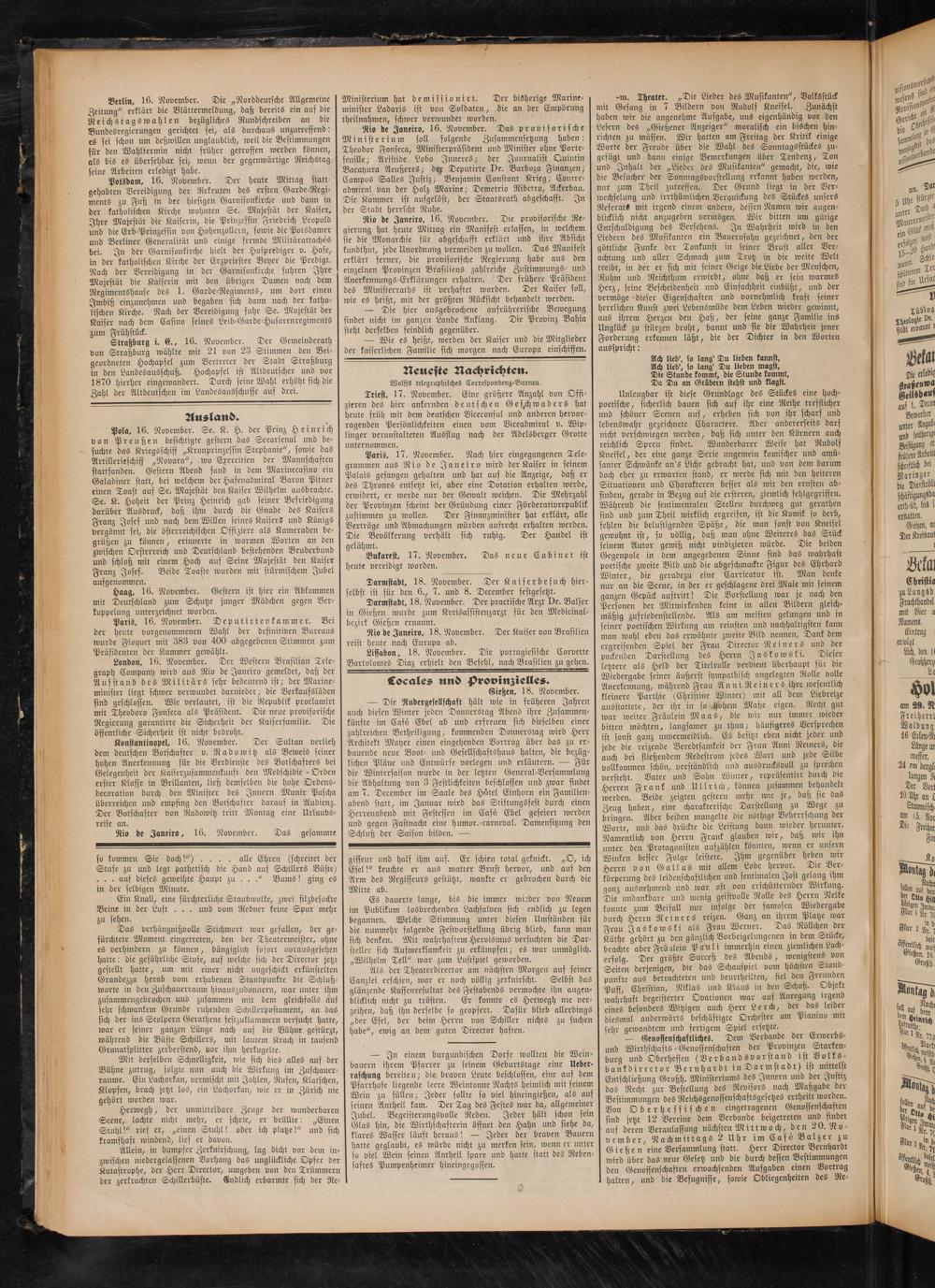 Rio de Janeiro, 16. November. Die provisorische Regierung hat heute Mittag ein Manifest erlassen, in welchem sie die Monarchie für abgeschafft erklärt und ihre Absicht kundthut, jede Unordnung vermeiden zu wollen. Das Manifest erklärt ferner, die provisorische Regierung habe aus den einzelnen Provinzen Brasiliens zahlreiche Zustimmungs- und Anerkennungs-Erklärungen erhalten. Der frühere Präsident des Ministerraths ist verhaftet worden. Der Kaiser soll, wie es heißt, mit der größten Rücksicht behandelt werden.