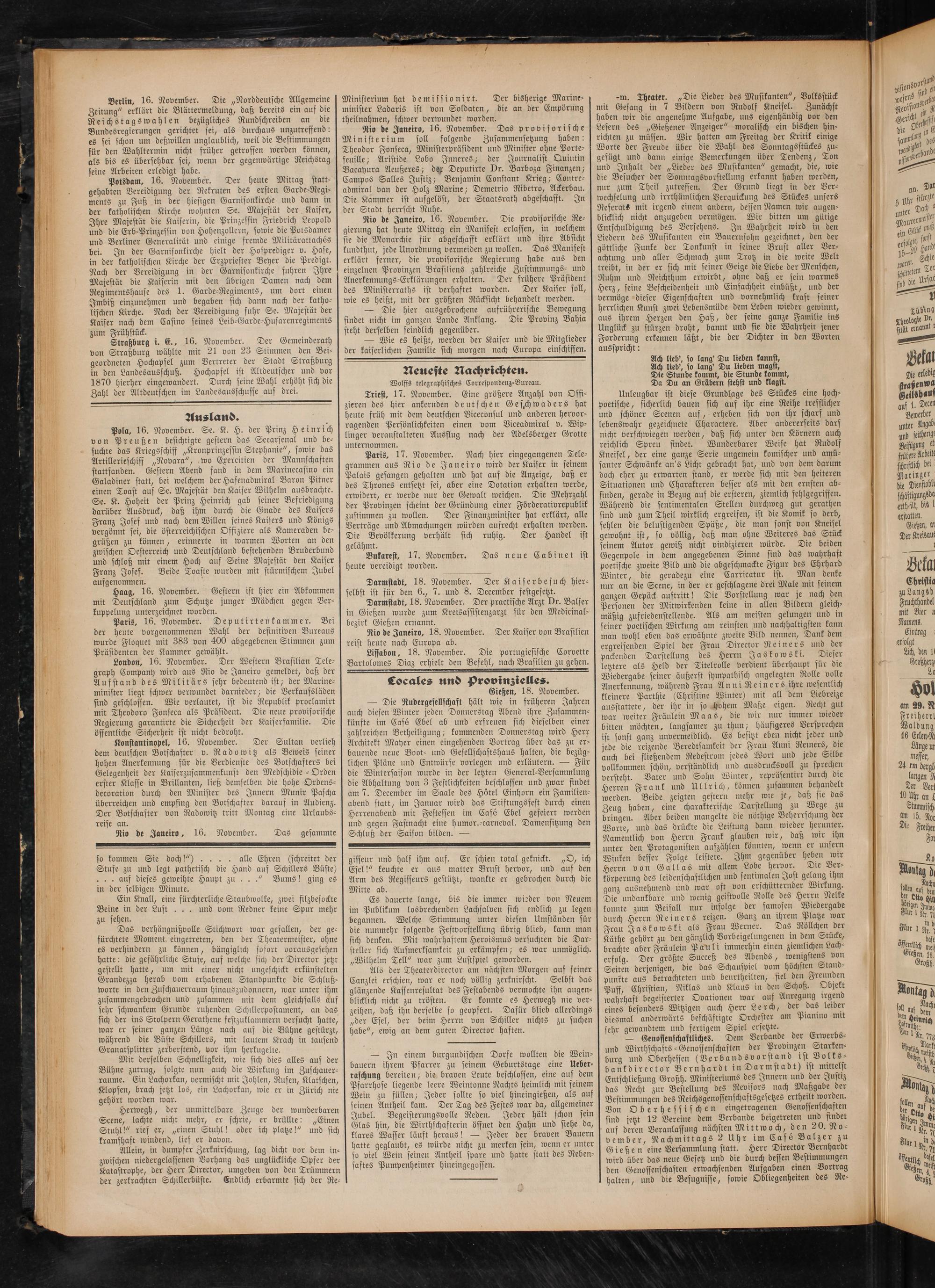 London, 16. November. Der Western Brasilian Telegraph Company wird aus Rio de Janeiro gemeldet, daß der Auf st and des Militärs sehr bedeutend ist- der Marine- minister liegt schwer verwundet darnieder- die Verkaufsläden sind geschloffen. Wie verlautet, ist die Republik proclamirt mit Theodors Fonseca als Präsident. Die neue provisorische Regierung garantirte die Sicherheit der Kaisersamilie. Die öffentliche Sicherheit ist nicht bedroht.