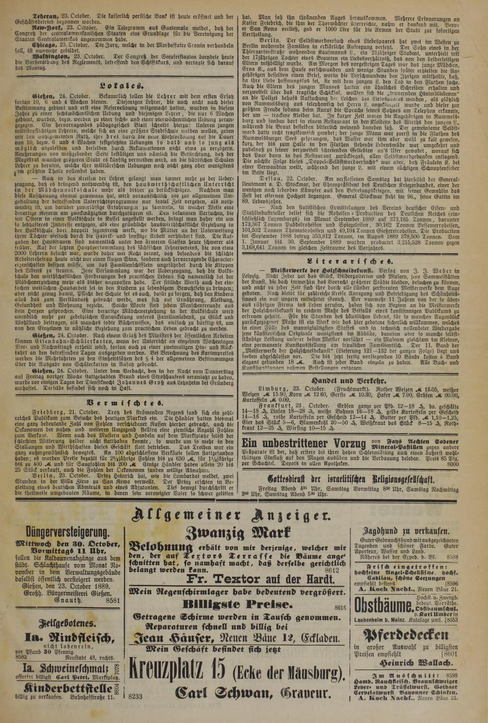 Limburg, 23. October. (Fruchtmarkt). Rother Weizen JL 16.05, weißer Weizen JL 15 90, Korn JL 12 60, Gerste JC. 10.30, Hafer JL 7.00, Erbsen JL 00.00, Kartoffeln JL 0.00.