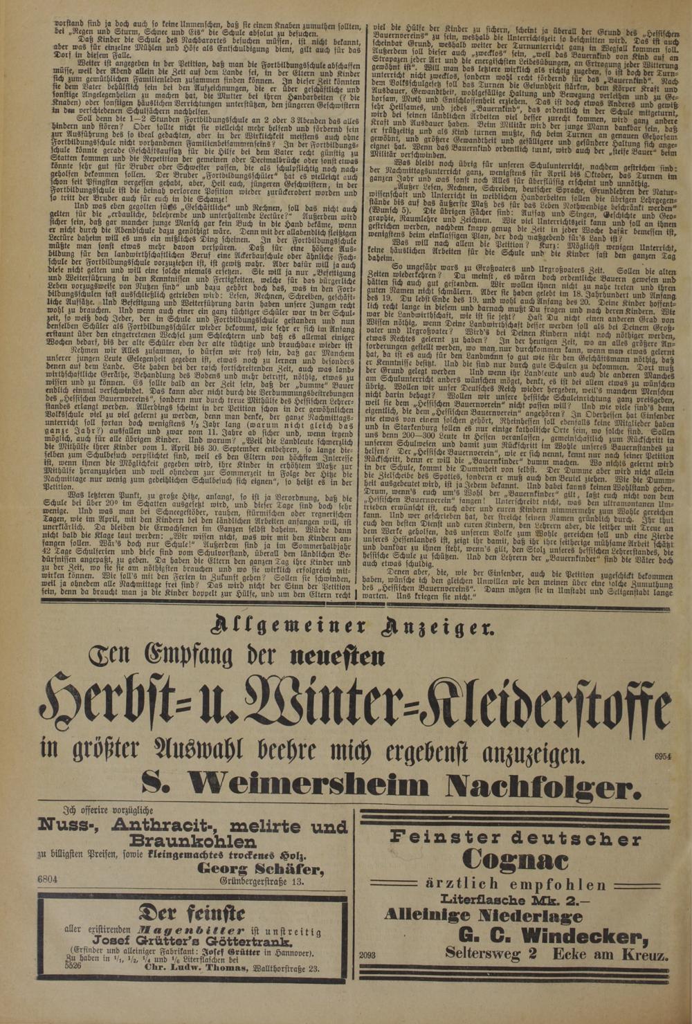 Wetter ist angegeben in der Petition, daß man die Fortbildungsschule abschaffen muffe, weil der Abend allein die Zeit auf dem Lande sei, in der Ellern und Kinder sich zum gemüthlichen Familienleben zusammen finden können. In dieser Beit könnten He dem Vater behülfltch sein bet den Aufzeichnungen, die er über geschäftliche und sonstige Angelegenheiten zu machen hat, die Mutter bet ihren Handarbeiten (? die Knaben) oder sonstigen häuslichen Verrichtungen unterstützen, den jüngeren Geschwistern in de» verschiedenen Schulfächern nachhelfen.