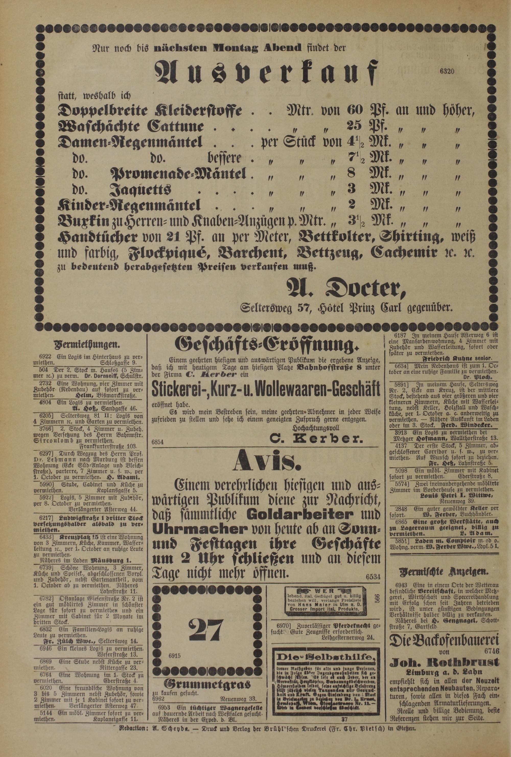 Einem geehrten hiesigen und auswärtigen Publikum die ergebene Anzeige, daß ich mit heutigem Tage am hiesigen Platze Bahnhofstraße 8 unter der Firma C* Herber ein