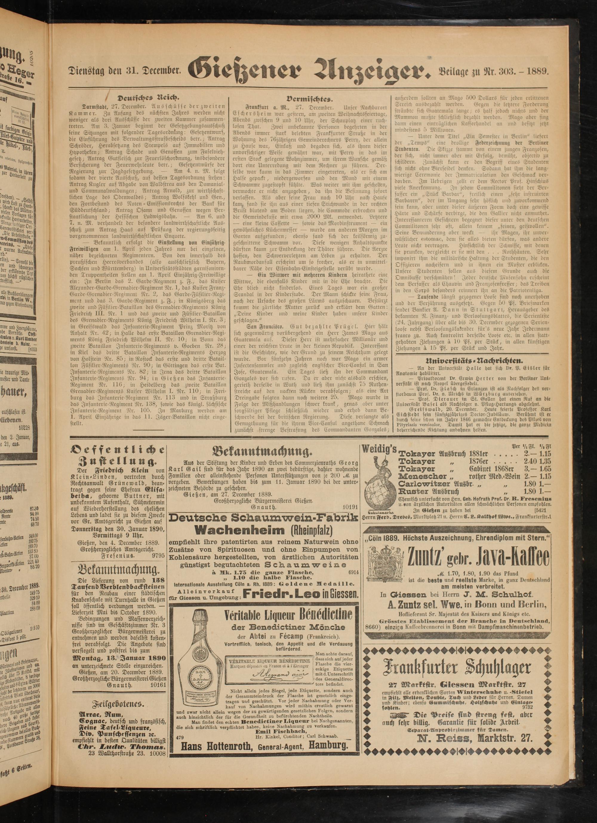 Gießen, am 20. December 1889. Grobherzogliche Bürgermeisterei Gießen