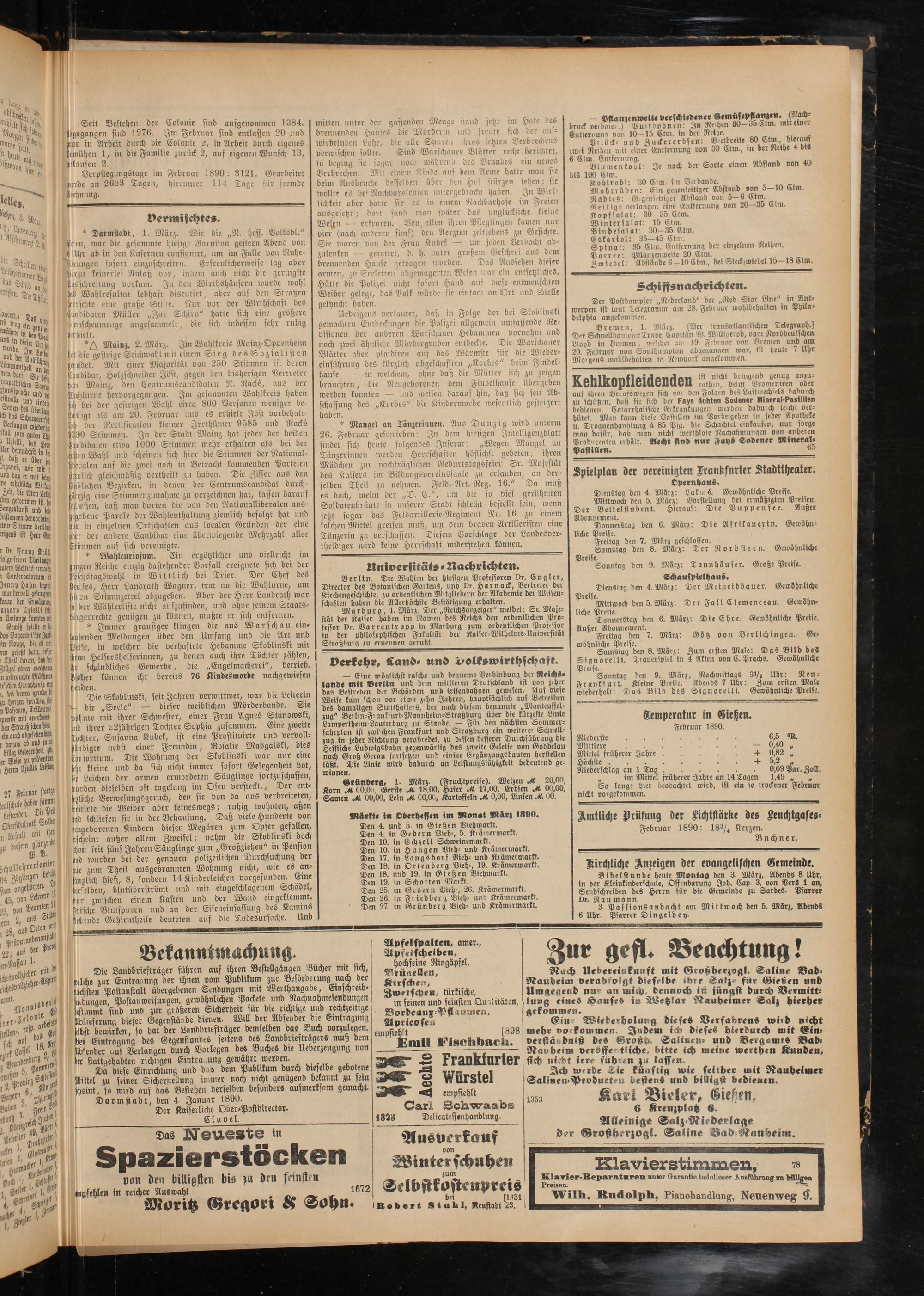 Märkte in Oberhesten im Monat März 1890.