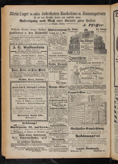 Nähere Auskunft ertheilt: Generalagent J. F. Hillebrand in Mainz, S. Elsoffer in Giessen, D. Waldbaum in Wohnbach, Jos. Gottlieb in Nidda, Jobs. Walther in Stockheim, Leopold Stern H in Schotten, Th. Andreas in Bad-Nauheim, Louis Gnifkowsky in Homberg a. d. O. (2214