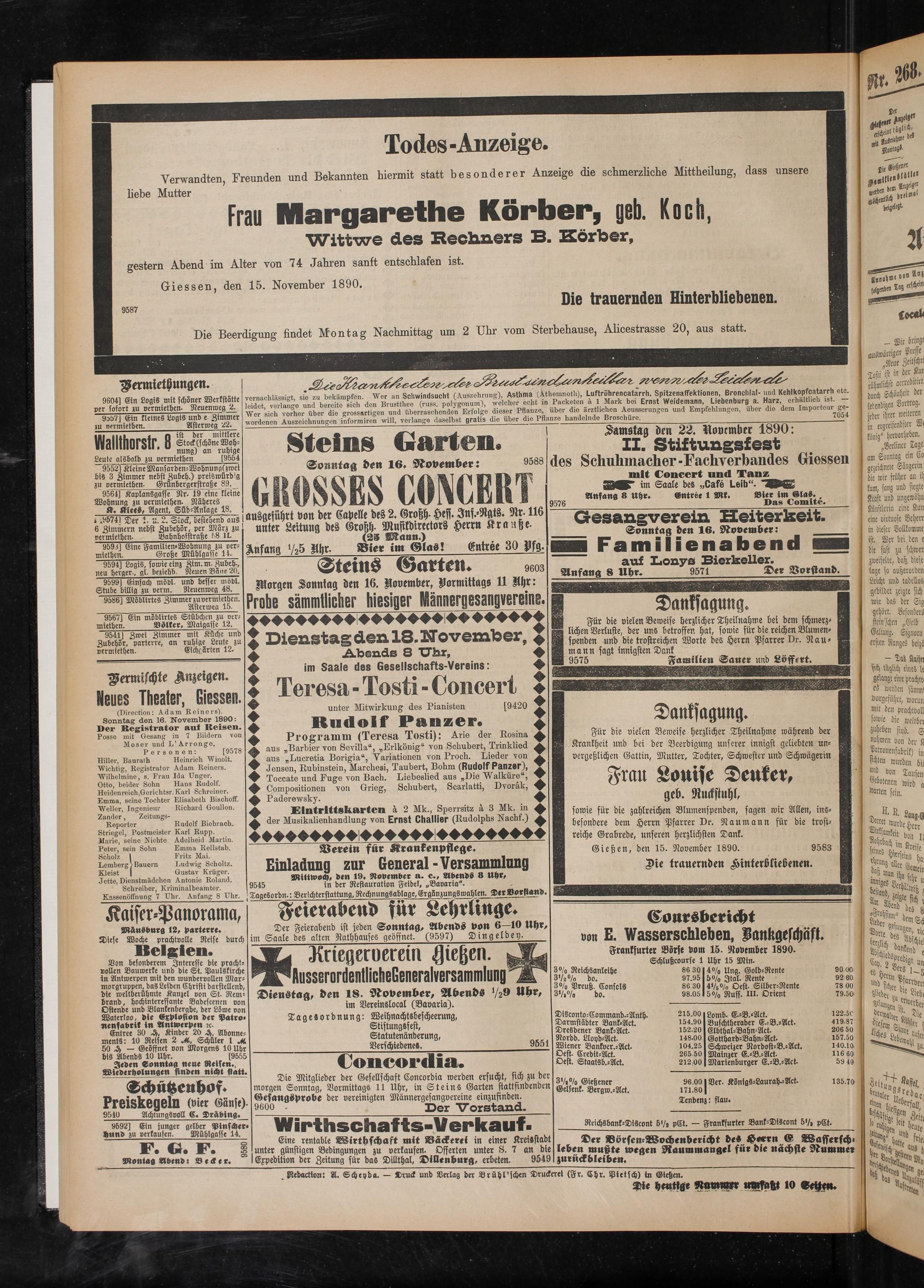 gestern Abend im Alter von 74 Jahren sanft entschlafen ist. Giessen, den 15. November 1890.
