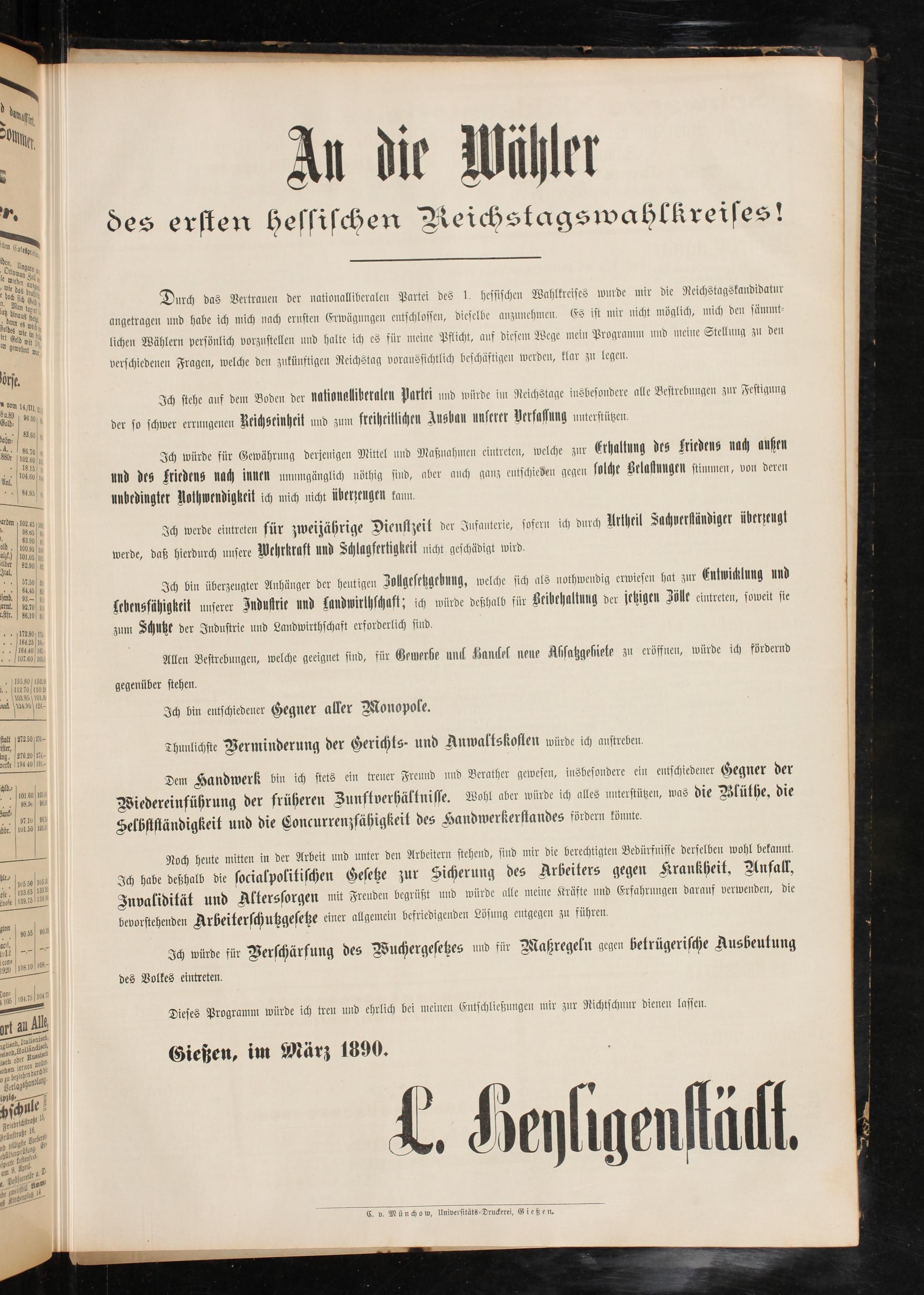 Durch das Vertrauen der natioualliberaleu Partei des 1. hessischen Wahlkreises wurde mir die Reichstagskaudidatur angetragen und habe ich mich nach ernsten Erwägungen entschlossen, dieselbe auzunchmcn. Es ist mir nicht möglich, mich den sanuut- lichen Wählern persönlich vorzustellen und halte ich es für meine Pflicht, auf diesem Wege mein Programm nnd meine Stellung z» den verschiedenen Fragen, welche den zukünftigen Reichstag voraussichtlich beschäftigen werden, klar zn legen.