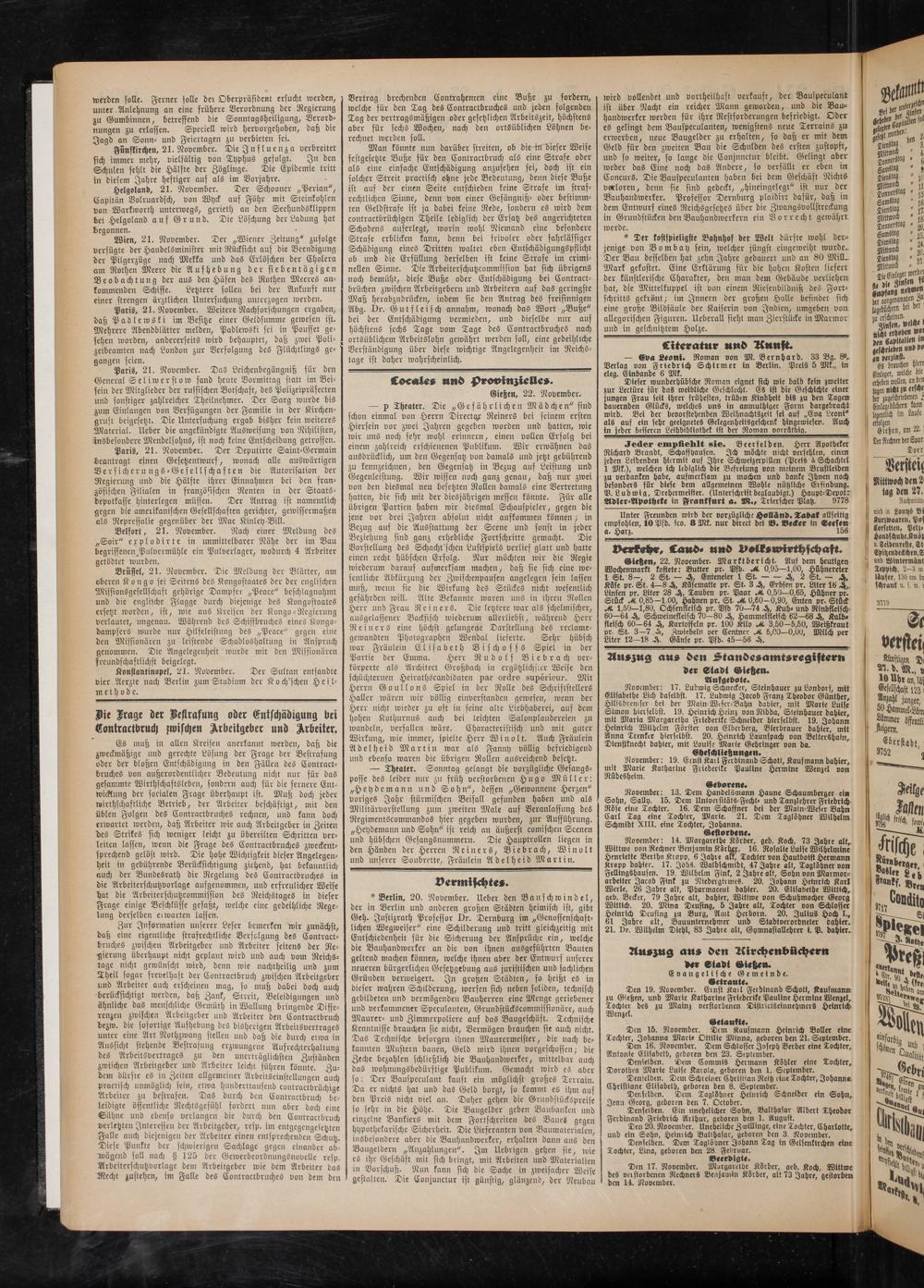 November: 13. Dem Handelsmann Hanne Schaumberger ein Sohn, Sally. 15. Dem Universitäts-Fechtt und Tanzlehrer Friedrich Röse eine Tochter. 16. Dem Schaffner bet der Main-Weser Bahn Carl Tag eine Tochter, Marie. 21. Dem Taglöhner Wilhelm Schmidt XIII. eine Tochter, Johanna.
