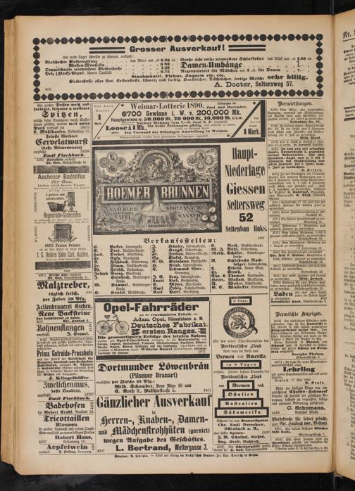 Deutsches Fabrikat W ersten Ranges. HZ Ule grossartigsten Erfolge der letzten Saison wurden mit Opel-Fahrrädern errungen, so die Meisterschaften von Eurona England, Deutschland, Preussen, Süddeutschland, Westfalen, Böhmen, Hassern Bayern, Mähren, Schlesien und des Continents. Opel-Rader sind zu I beziehen in Giessen durch: Wilhelm Hamel (Blechstrasse), alleiniger [ Vertreter für Glessen.