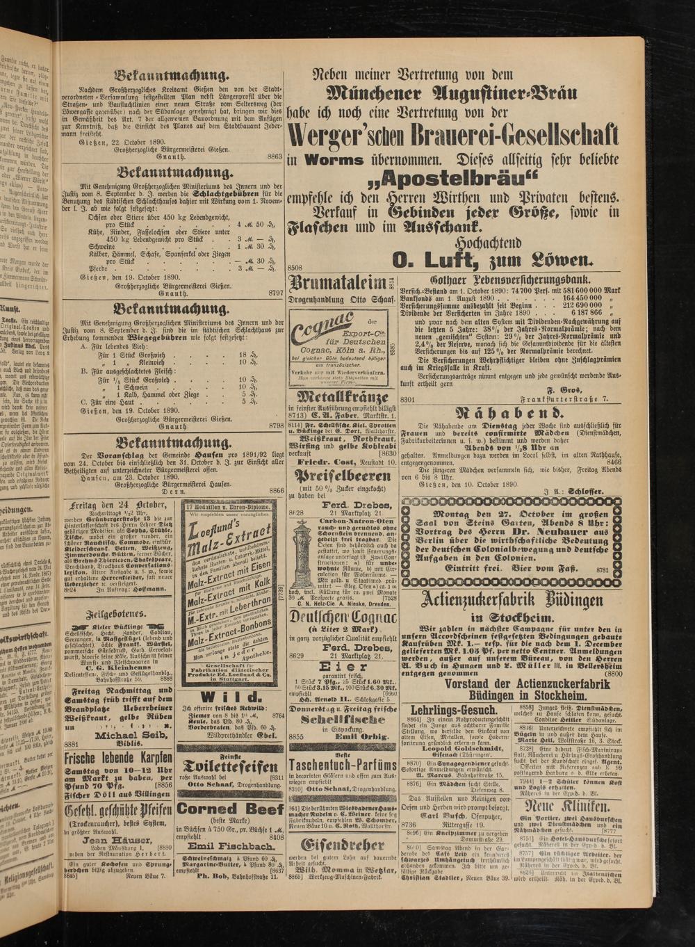Kälber, Hämmel, Schafe, Spanferkel oder Ziegen pro Stück Pferde Gießen, den 19. October 1890.
