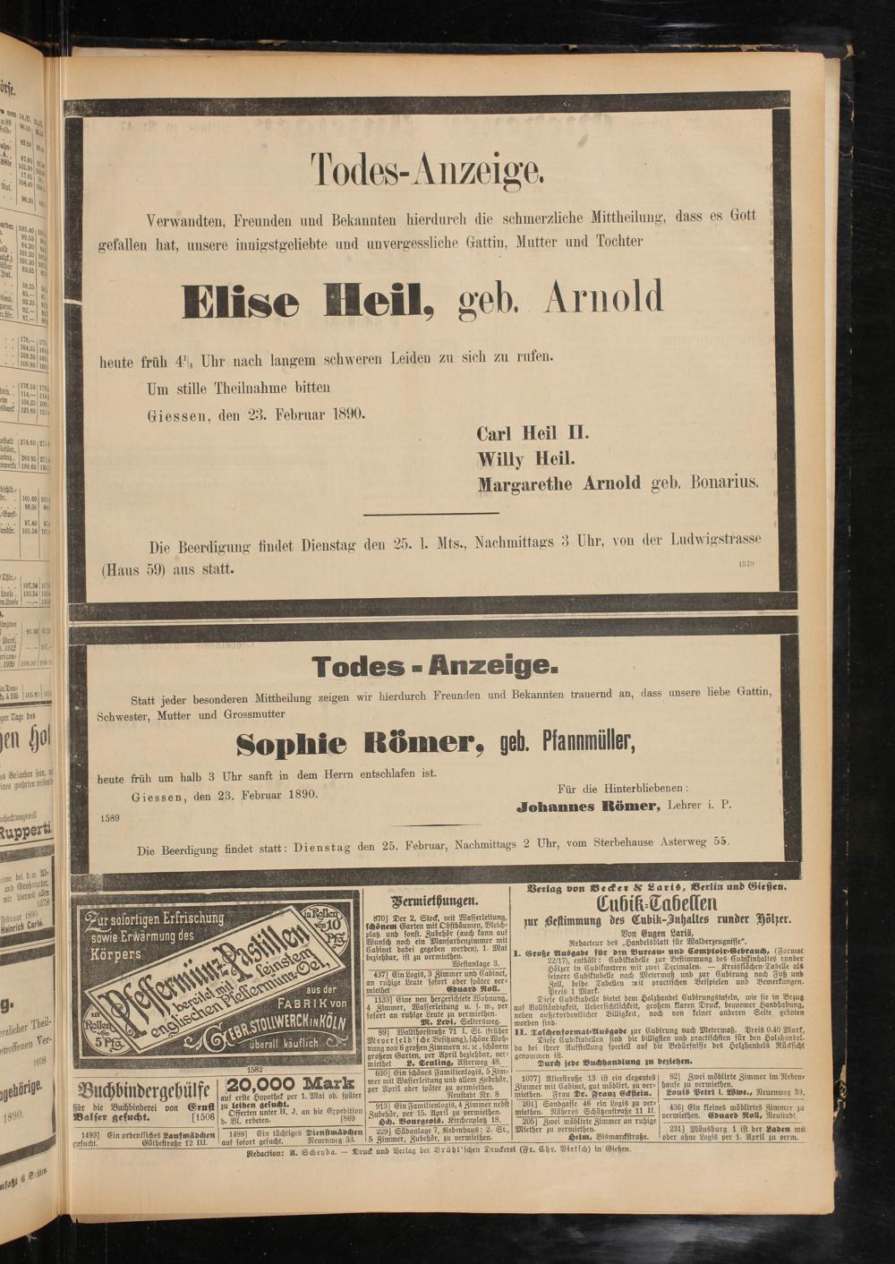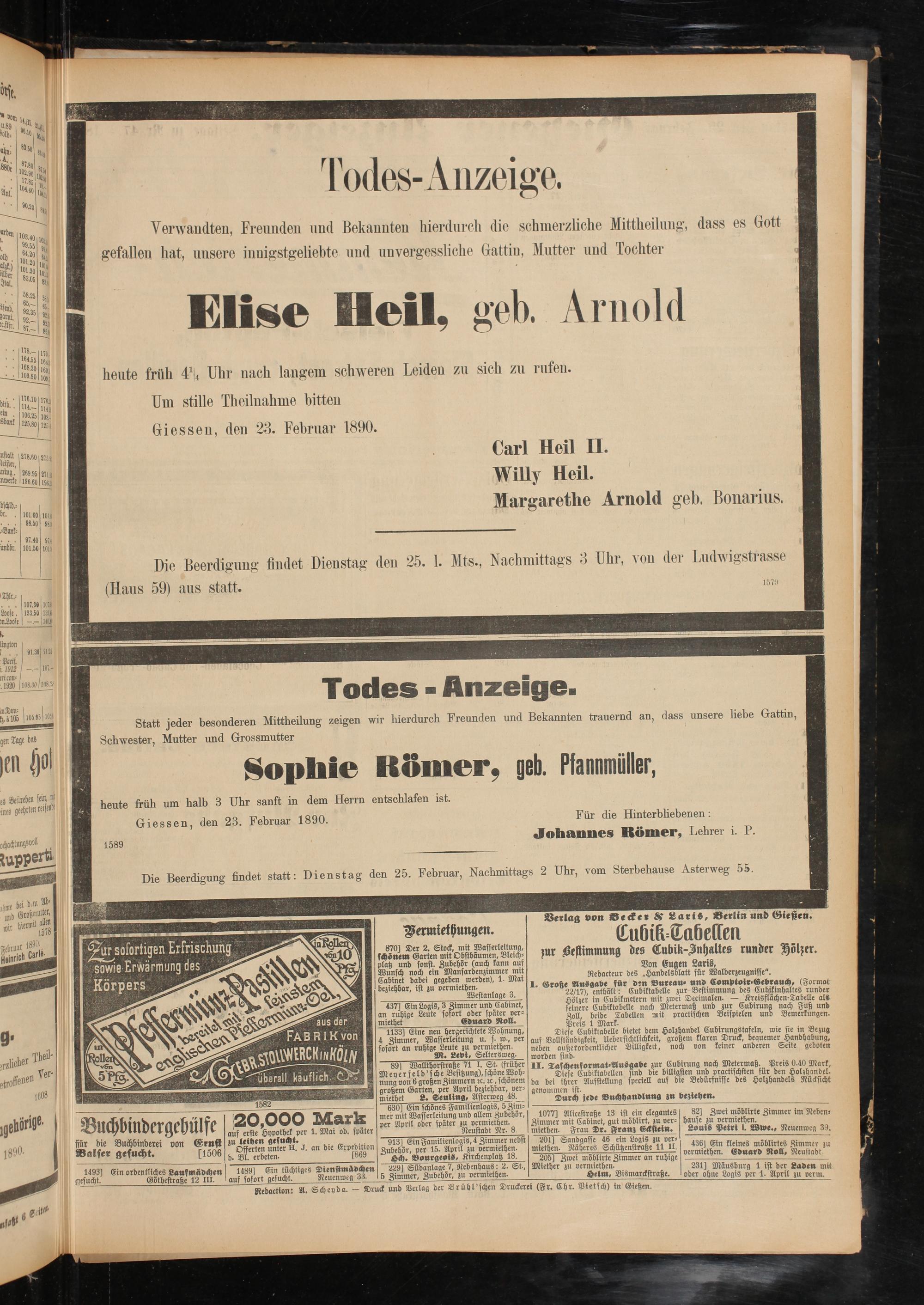 Die Beerdigung findet Dienstag den 25. 1. Mts., Nachmittags 3 Uhr, von der Ludwigstrasse (Haus 59) aus statt.