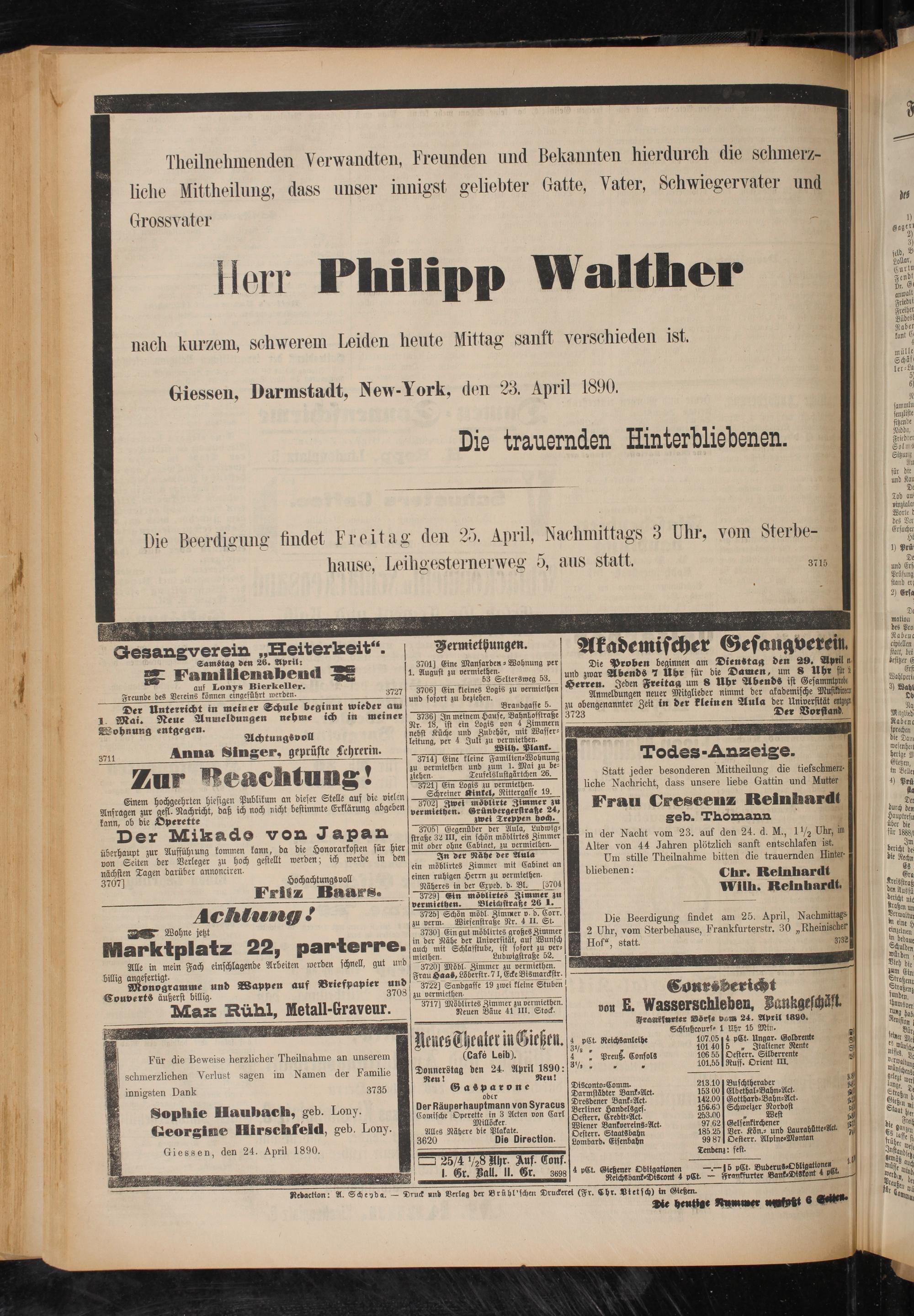 Die Beerdigung findet am 25. April, Nachmittags 2 Uhr, vom Sterbehause, Frankfurterstr. 30 „Rheinischer Hof“, statt. 3732