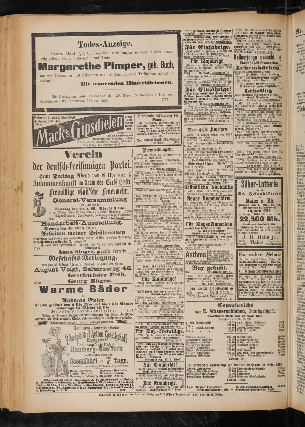 Nähere Außkanft erthellt: Generalagent J. F. Hillebrand in Mainz, S. Elsoffer in Giessen, L. Waldbaum in Wohnbach, Jos. Gottlieb in Nidda, Jobs. Walther in Stockheim, Leopold Stern U. in Schotten, Th. Andreas in Bad-Nauheim, Louis Gnifkowsky in Homberg a. d. O. [2214