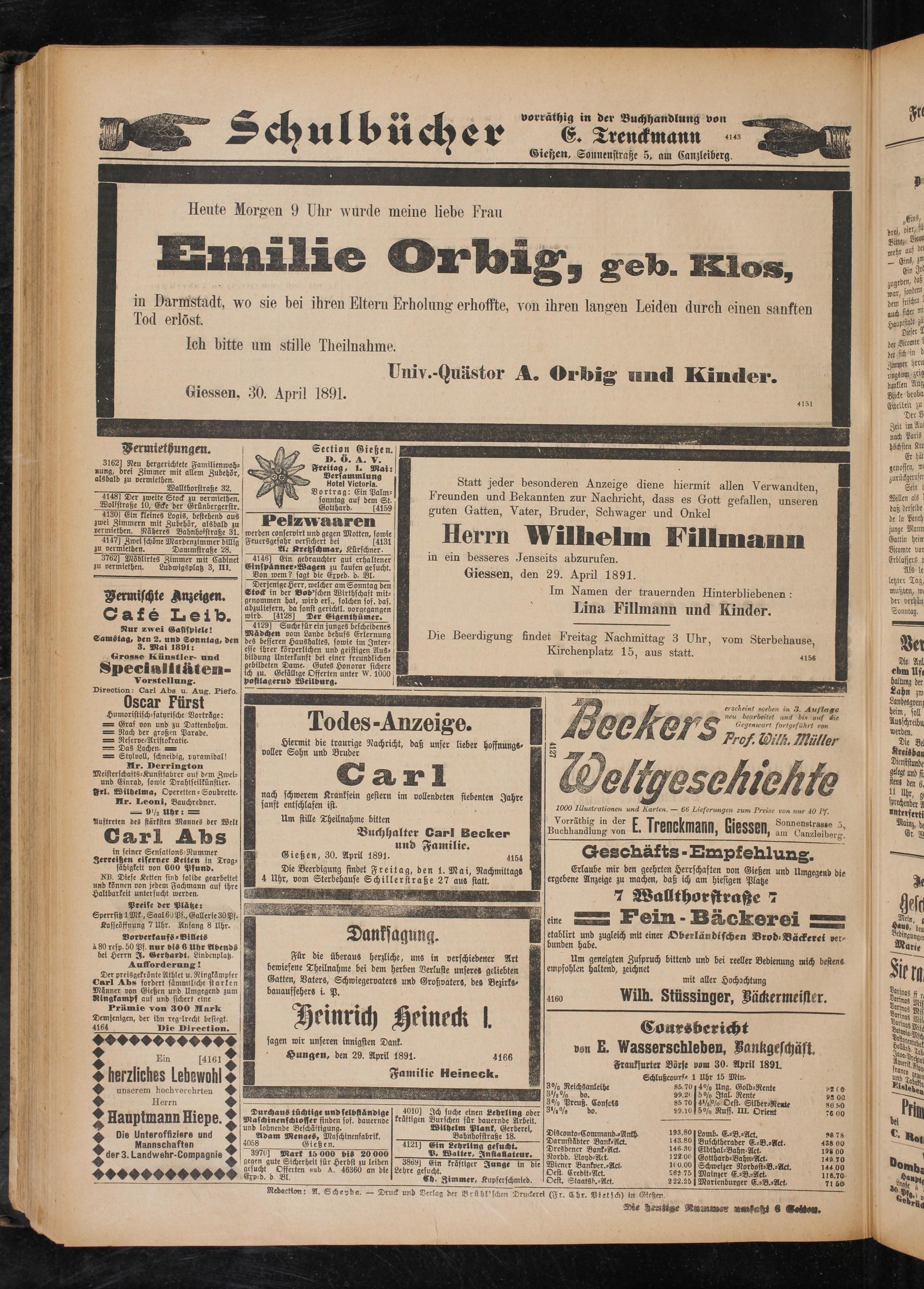 sagen wir unseren innigsten Dank. Hungen, den 29. April 1891.