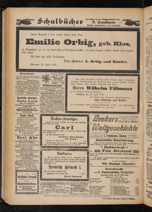 Die Beerdigung findet Freitag, den 1. Mai, Nachmittags 4 Uhr, vom Sterbehause Schillerstraße 27 aus statt.