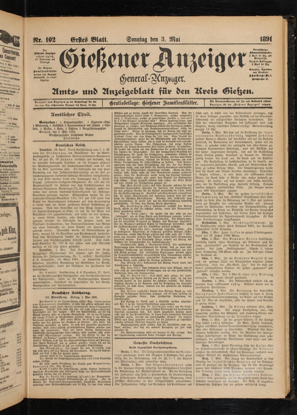 Nr. 102 Erstes Blatt. Sonntag den 3. Mai