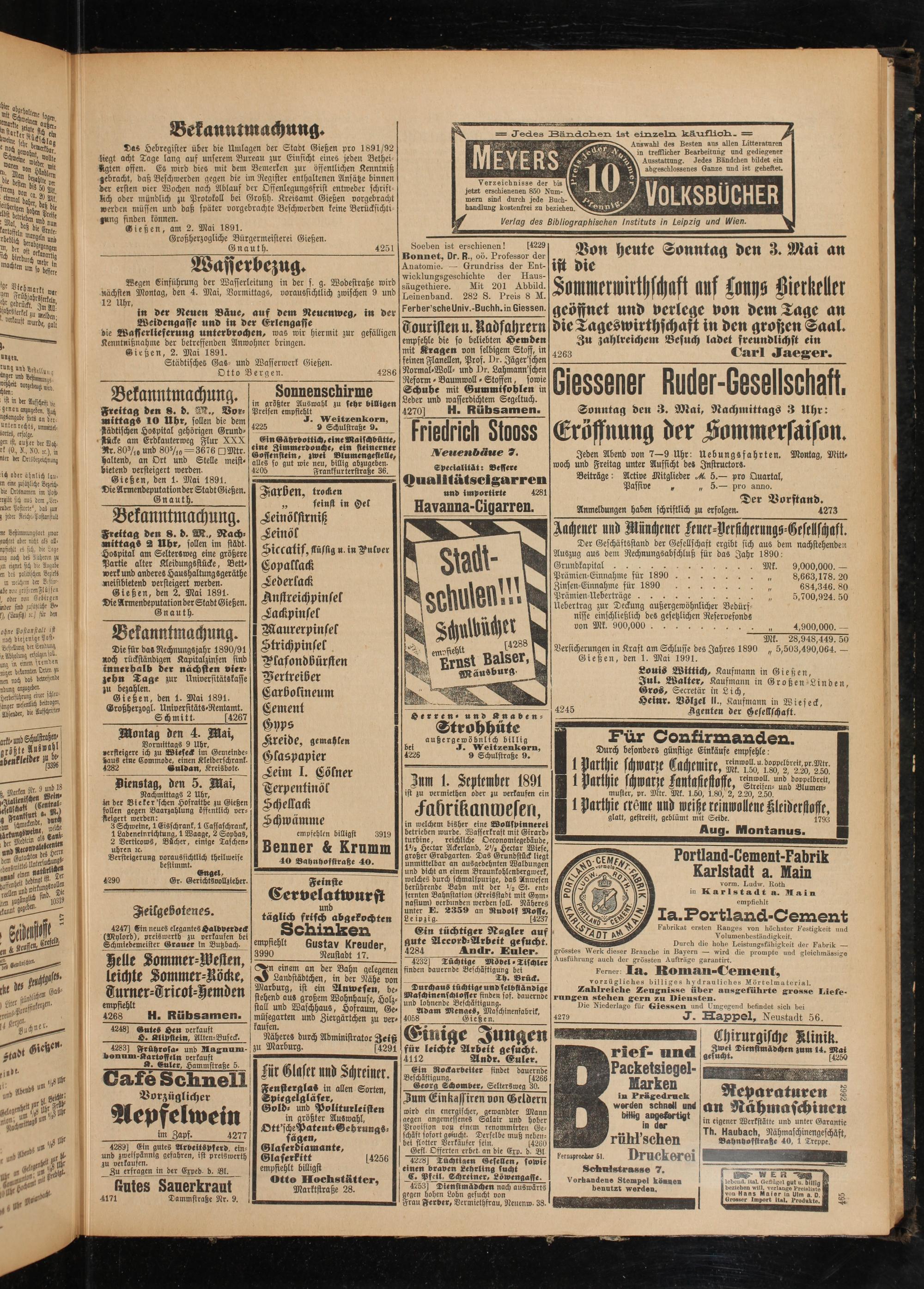Des Hebregister über die Umlagen der Stadt Gießen pro 1891/92 liegt acht Tage lang auf unserem Bureau zur Einsicht eines jeden Bethei- Kgten offen. Es wird dies mit dem Bemerken zur öffentlichen Kenntniß gebracht, daß Beschwerden gegen die im Register enthaltenen Ansätze binnen der ersten vier Wochen nach Ablauf der Offenlegungsfrist entweder schriftlich oder mündlich zu Protokoll bei Großh. Kreisamt Gießen vorgebracht «erden müssen und daß später vorgebrachte Beschwerden keine Berücksichtigung finden können.