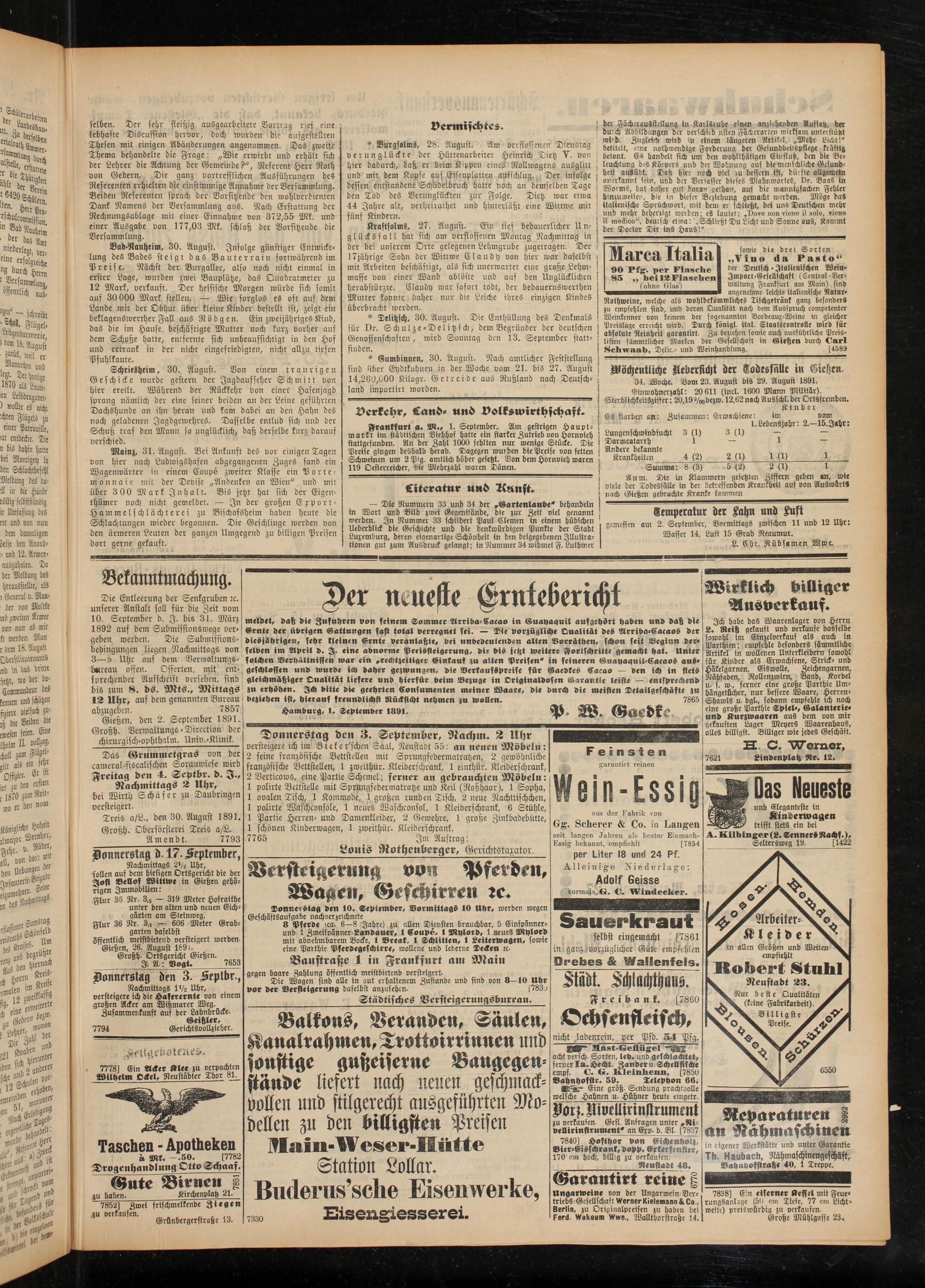 | Wöchentliche Meberficht der Todesfälle in Eießen. 34. Woche. Vom 23. August dis 29. August 1891. Einwohnerzahl: 20 611 (tncl. 1600 Mann Militär).