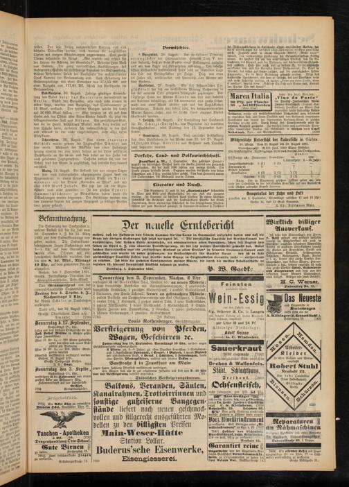 Frankfurt a. M., 1. September. Am gestrigen Hauptmarkt im städtischen Viehhof hatte ein starker Zutrieb von Hornvieh stattgefunden. An der Zahl 1000 fehlten nur wenige Stucke. Die Preise gingen desbalb herab. Dagegen wurden die Preise von fetten Schweinen um 2 Plg. amtlich höher gesetzt. Von dem Hornvieh waren 119 Oesterreicher, die Mehrzahl waren Dänen.