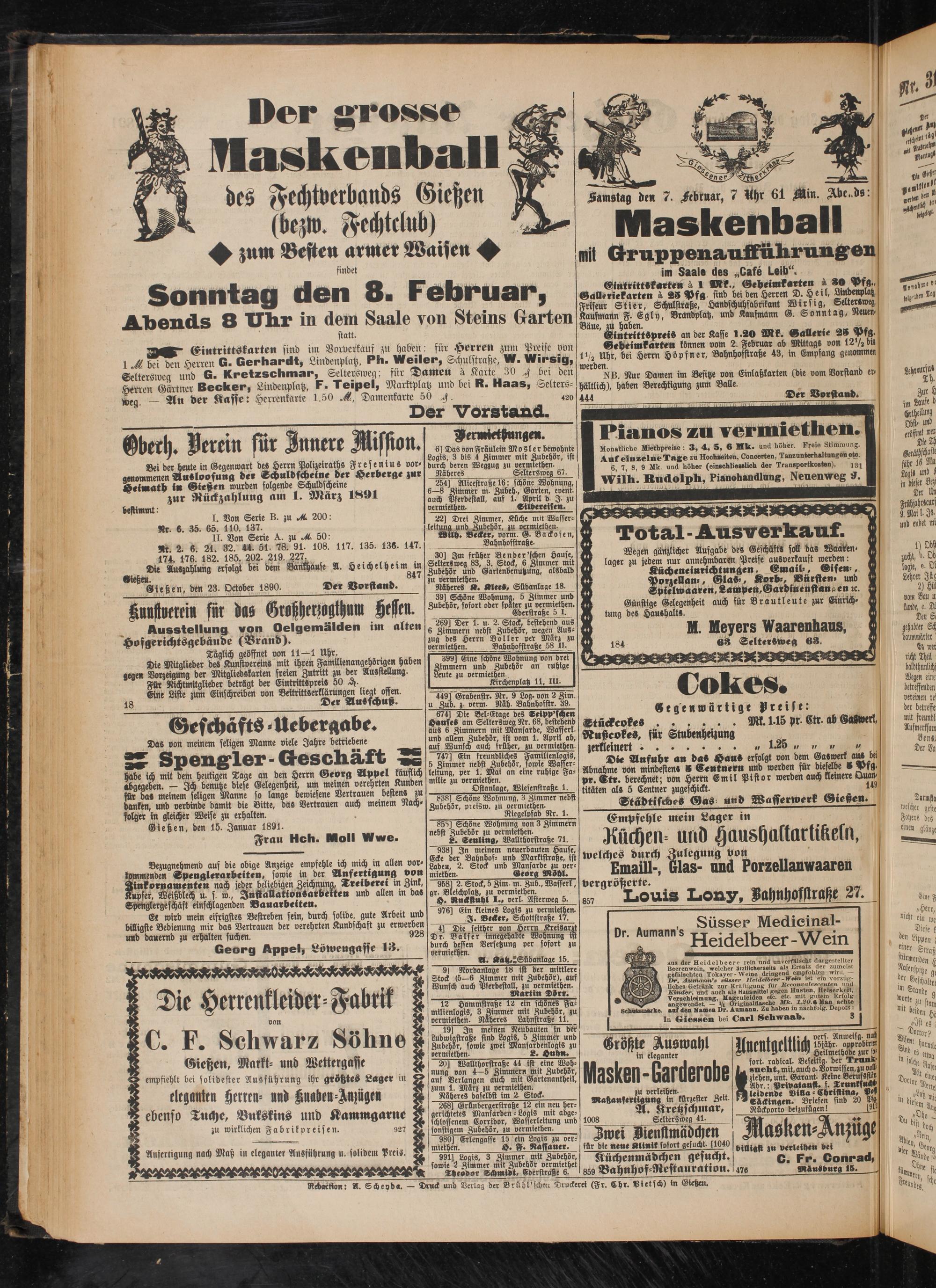 Der grosse Maskenball des Fechtverbands Gießen (bezw. Fechtclub) zum Beste« armer Waise« findet